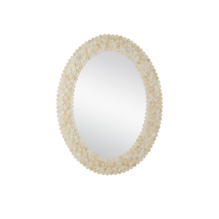 Description: The Merriam Oval Mirror has an lovely frame fitted with over 200 hand-ground buffalo-bone discs. The color variations in the delicate bone bring this ivory decorative mirror a textural interest, while the painstaking placement of the circlets brings it a sophisticated feel. There is no bevel on the mirror.