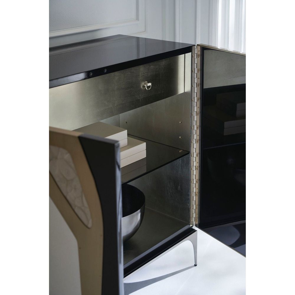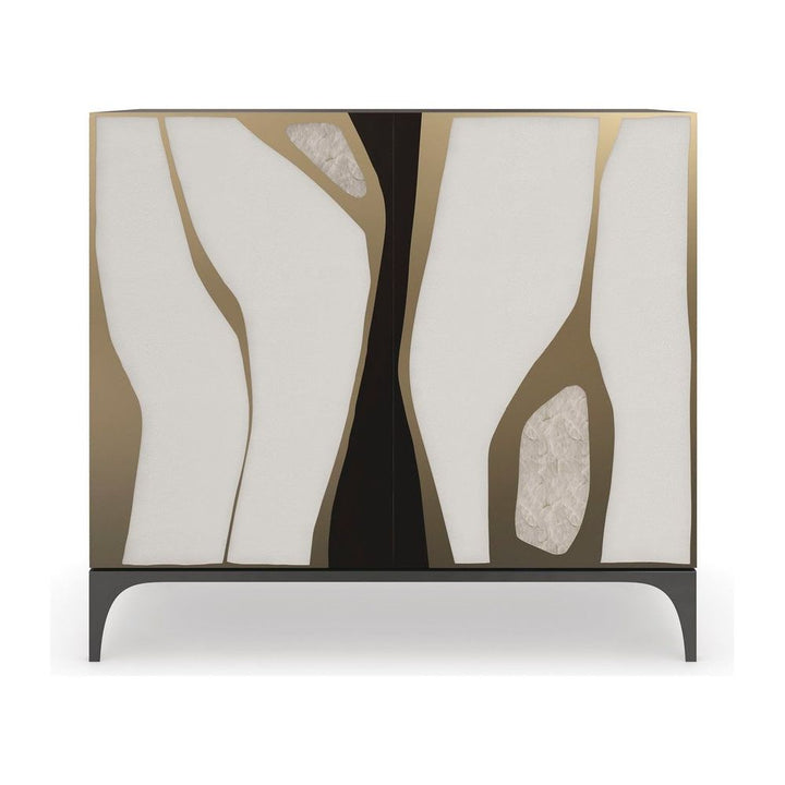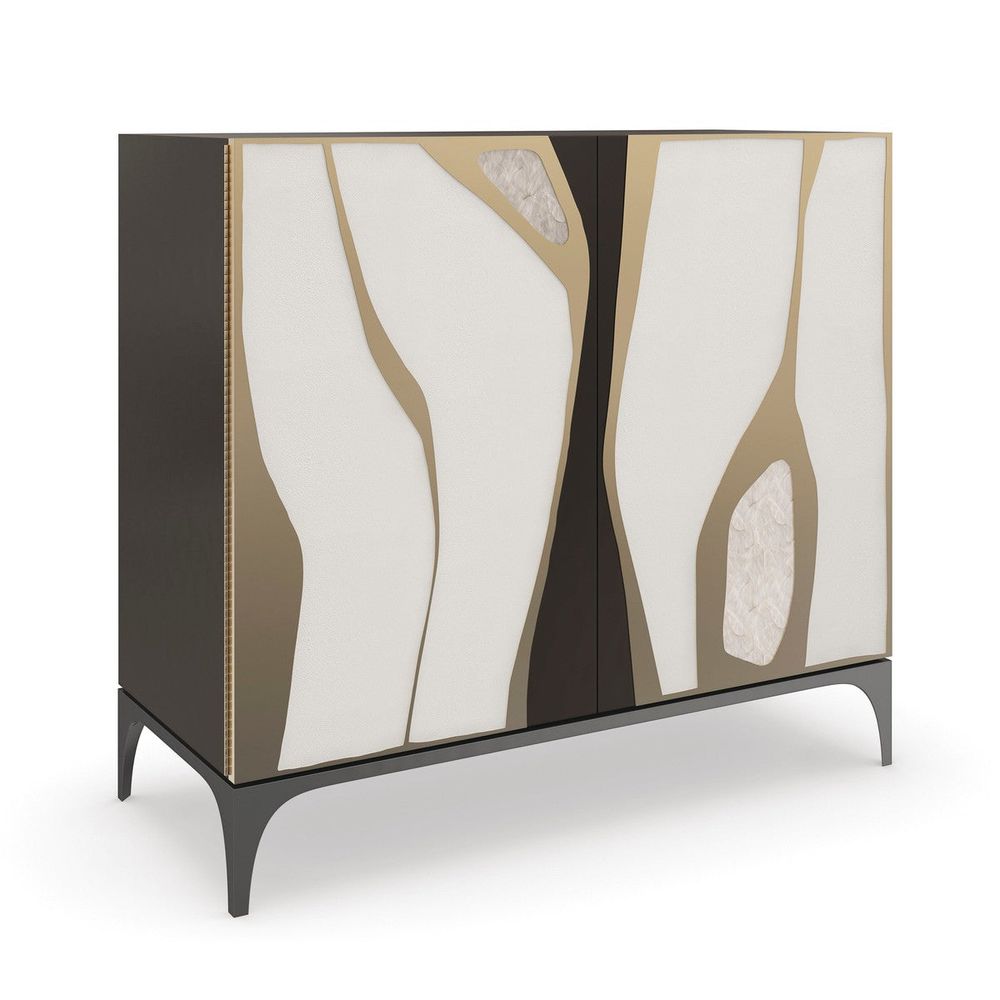 With the utmost attention to detail, craft and functionality, this bar cabinet evokes the rhythmic flow of traffic in and around a city. Making a luxe statement: door fronts framed in a Chocolate Truffle lacquer and finished in a tactile mix of faux shagreen and Cafe Latte hand-printed resin with a Brushed Gold overlay. The mirrored interior offers ample space for keeping entertaining essentials, with an adjustable glass shelf and a single drawer for storing mixing tools and linens.