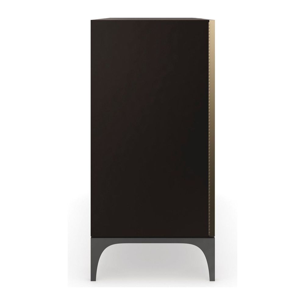 Features: Case in Chocolate Truffle.Metal base in TungstenTwo touch latch doors with front pattern in Faux Shagreen, Chocolate Truffle and Cafe Latte with metal overlay in Brushed Gold and top finger pulls.Interior features one drawer with Ombre Warm Silverleaf front and one adjustable glass shelf in Bronze Smoke glass.One drawer with front in Ombre Warm Silverleaf and soft close undermount guides.Drawer interior in Dark Chocolate. Case interior in Ombre Warm Silverleaf.