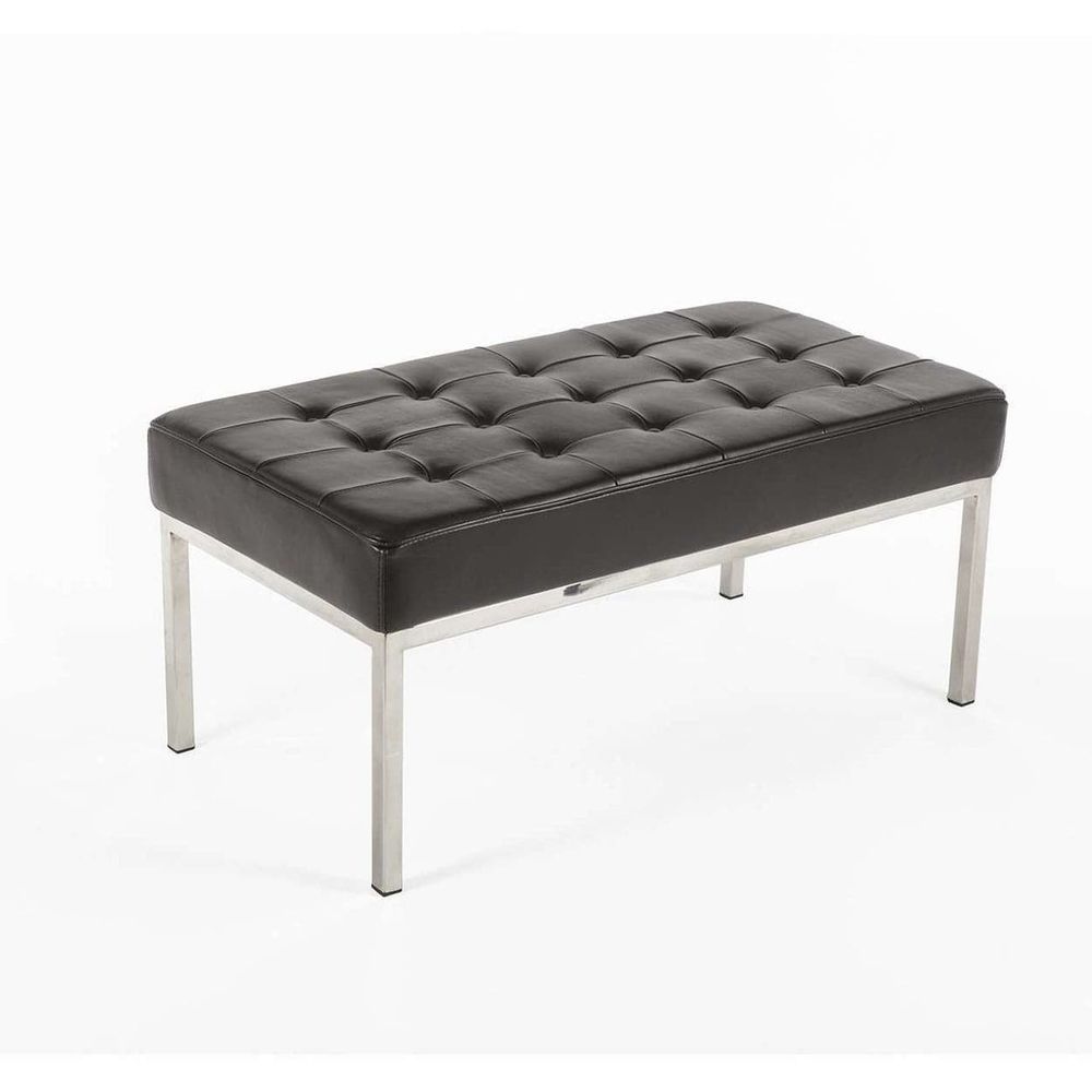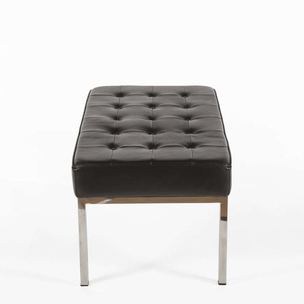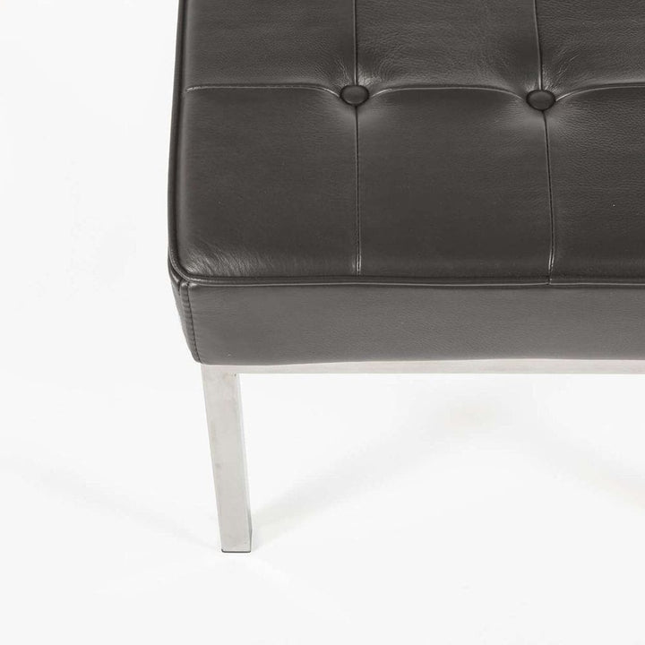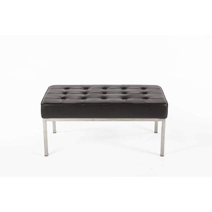 Inspired by the mid-century modern designs of Florence Knoll, this tufted bench is the perfect complement for any modern inspired space. The chromed stainless steel base provides sturdy support for the plush seat. High-density foam cushioning is upholstered in supple aniline leather composed of individually sewn squares, which have then been tufted for added comfort. This piece works great in formal and casual settings alike, as well as public spaces like museums and reception areas. Available in black or white.