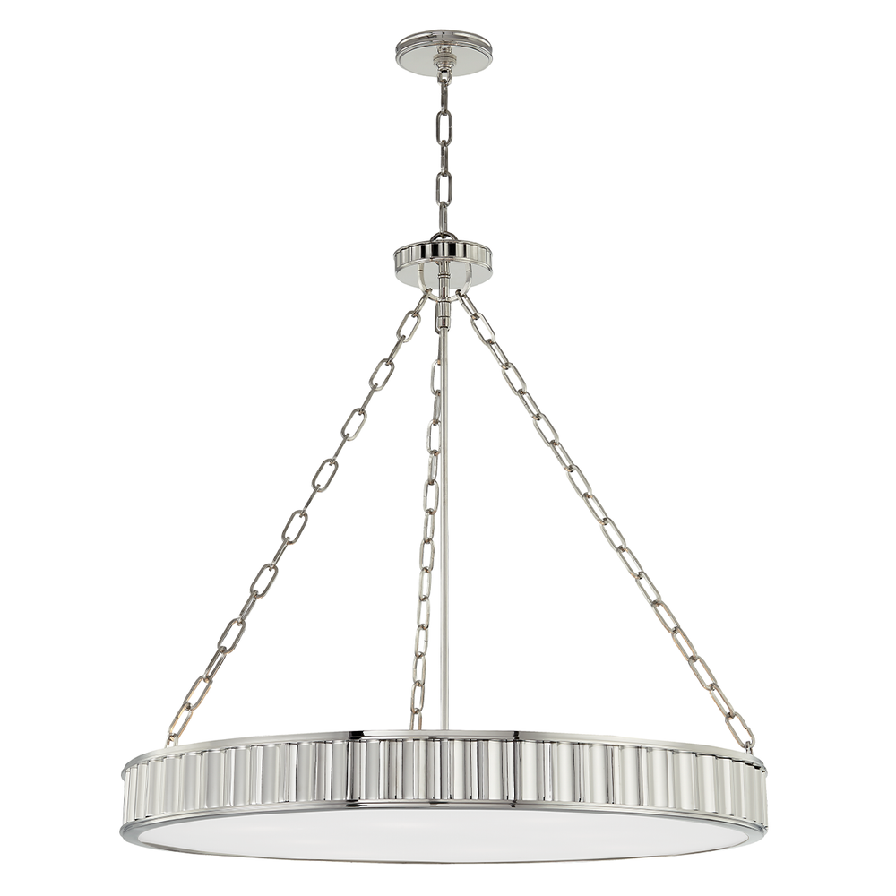 A glossy opal-glass shade is framed by corrugated metal for a look that creates waves and catches the eye. Bright, even light shines down and reflects off the chains of the semi flush, pendant and chandelier. Available as a flush, semi flush, pendant and chandelier in both round and square shapes and three finishes.