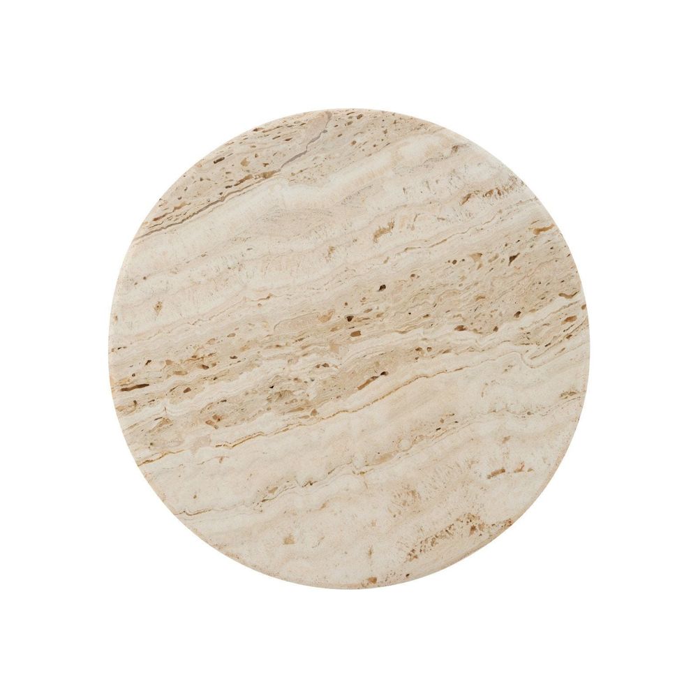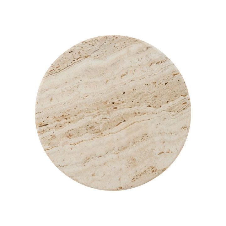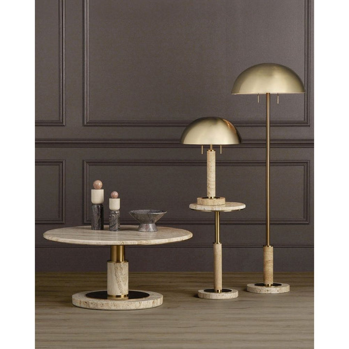 Description: Made of travertine and brass in a polished brass finish, the Miles Travertine Accent Table has a telescoping personality. The interplay of metal and stone is a sophisticated aspect of this design, as the travertine column at the bottom has been drilled so the metal slices through it. The warmth of the finish on the metal draws out the darker veining in the natural material.