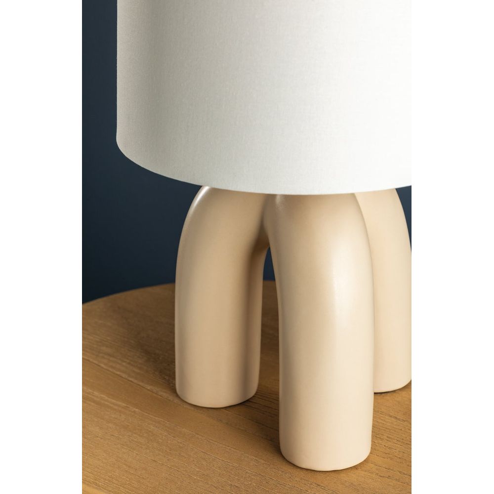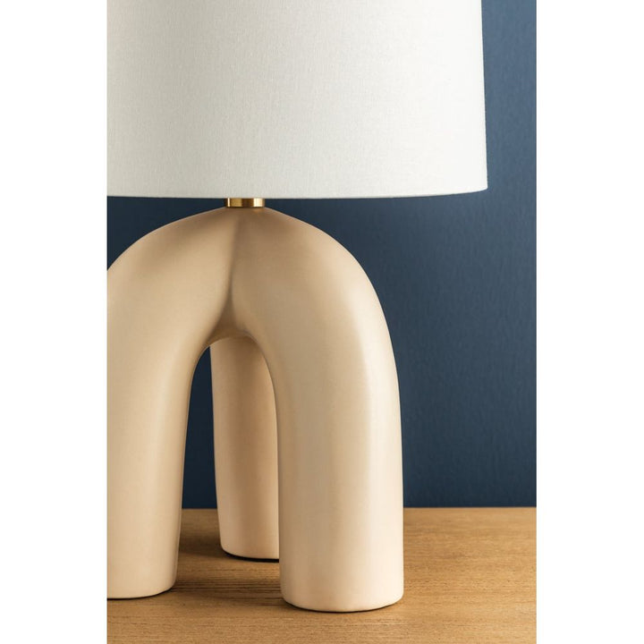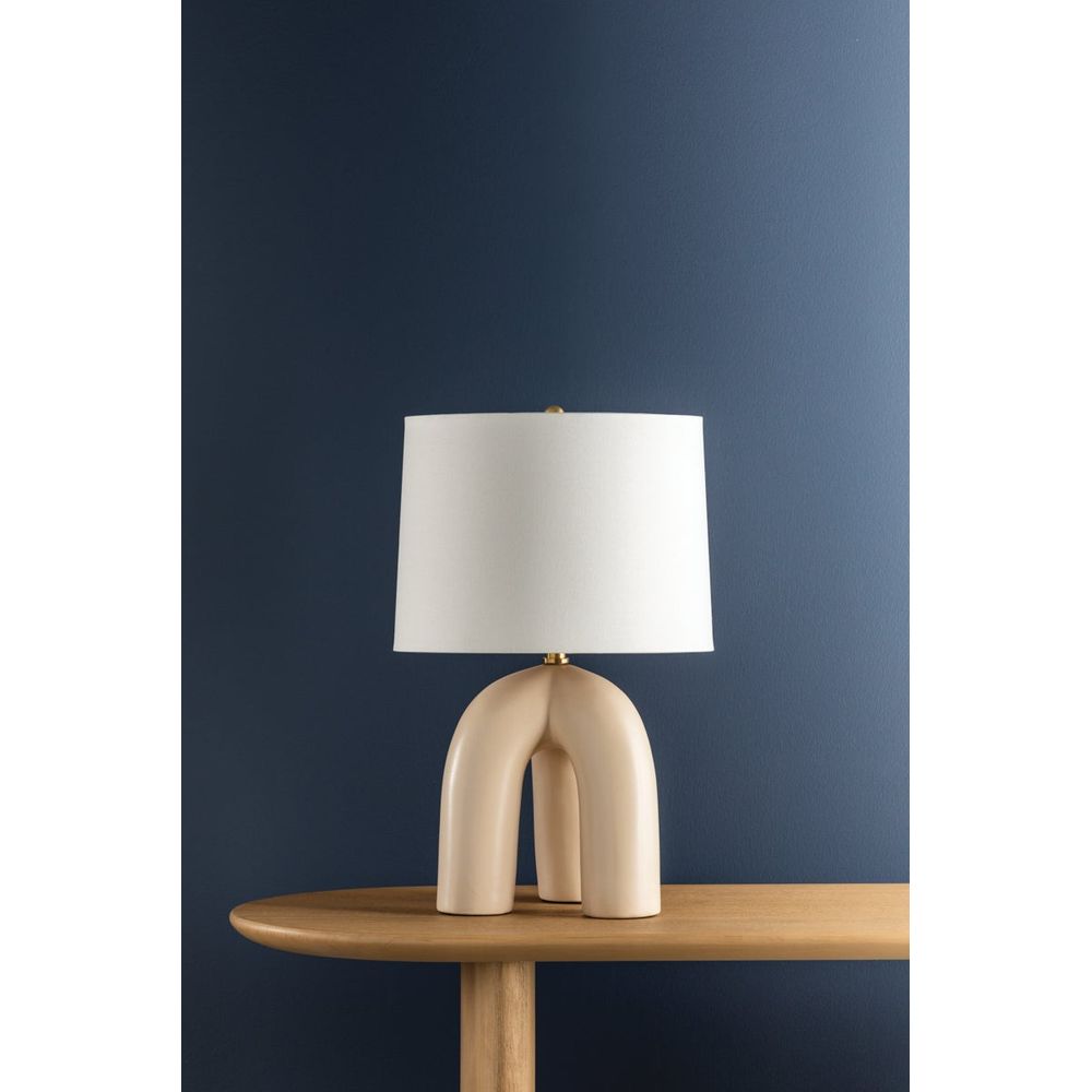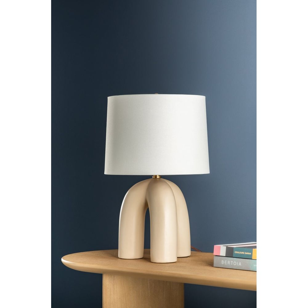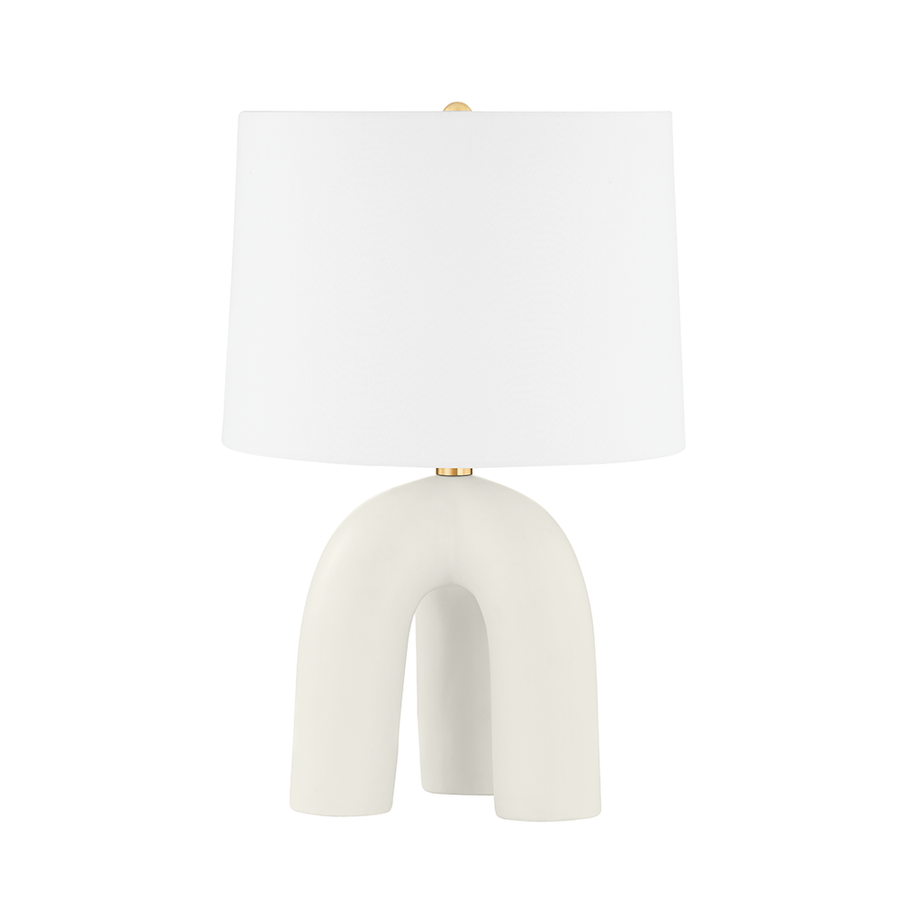 Charming and fun, Mills Pond reminds us not to take things so seriously. Three oversized tubular shapes form the tripod-like base of this delightful table lamp. A white linen shade in a similar size and shape to the base provides a soft light and a sense of balance. The aged brass finish paired with the satin ivory base adds just the right amount of subtle sophistication.