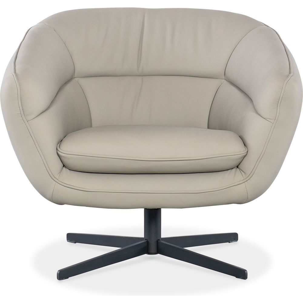 Description: Brimming with modern energy and an inviting style, the Mina Swivel Chair features a contemporary twist on the classic barrel-back chair, along with a low channeled back and sloped arms. It is upholstered in the semi-aniline top-grain Buckskin Beige leather and has a metal base.