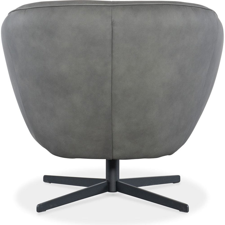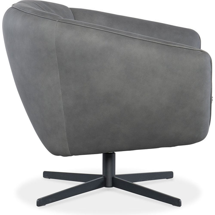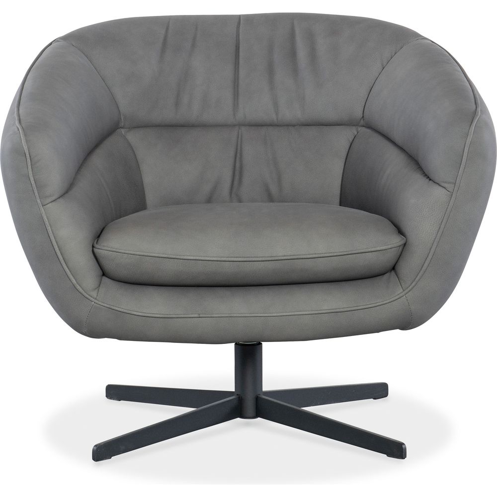 Description: Brimming with modern energy and an inviting style, the Mina Swivel Chair features a contemporary twist on the classic barrel-back chair, along with a low channeled back and sloped arms. It is upholstered in the semi-aniline top-grain Buckskin Dark Grey leather and has a metal base.
