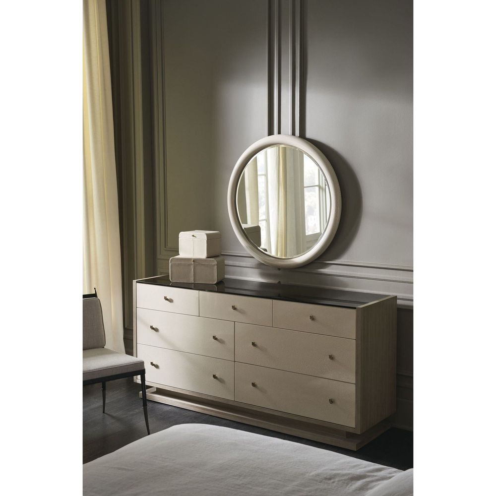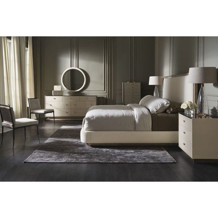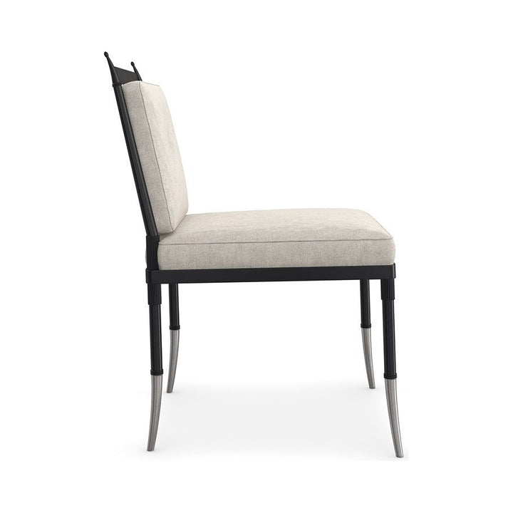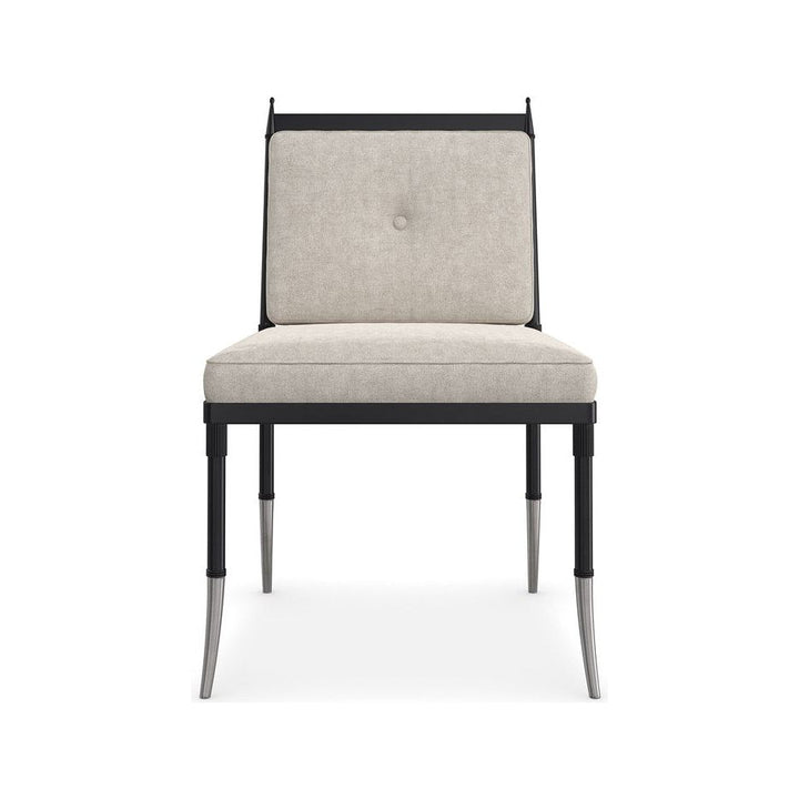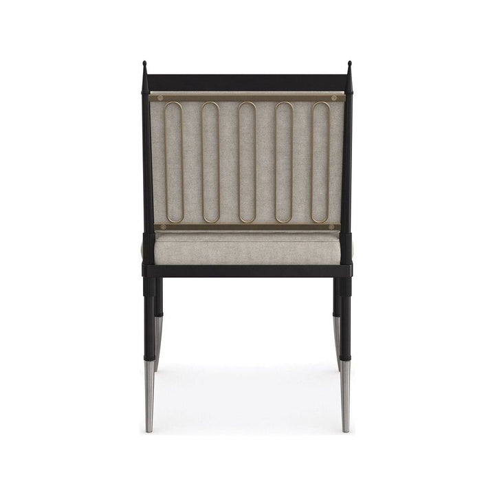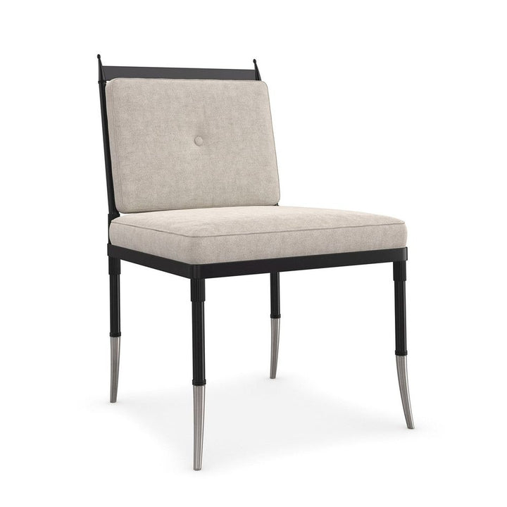 Inspired by the found beauty of a wrought iron gate, this petite seat balances the strength of metal with an exquisite mix of details and materials. Meticulously tailored in a crisp, light-toned linen, it features a button detail along the inside back and seat, accentuated by scrollwork along the back in a warm Brushed Gold finish. Tall, slender legs capped in Brushed Stainless metal ferrules lend a distinctive finishing touch. Style as a dining chair or mix in conversation spaces for an effortlessly elegant extra seat.