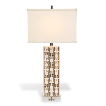 The classic key pattern is hand painted in a subtle mocha overglaze repeat on the crackled ivory rectangle column shaped porcelain.