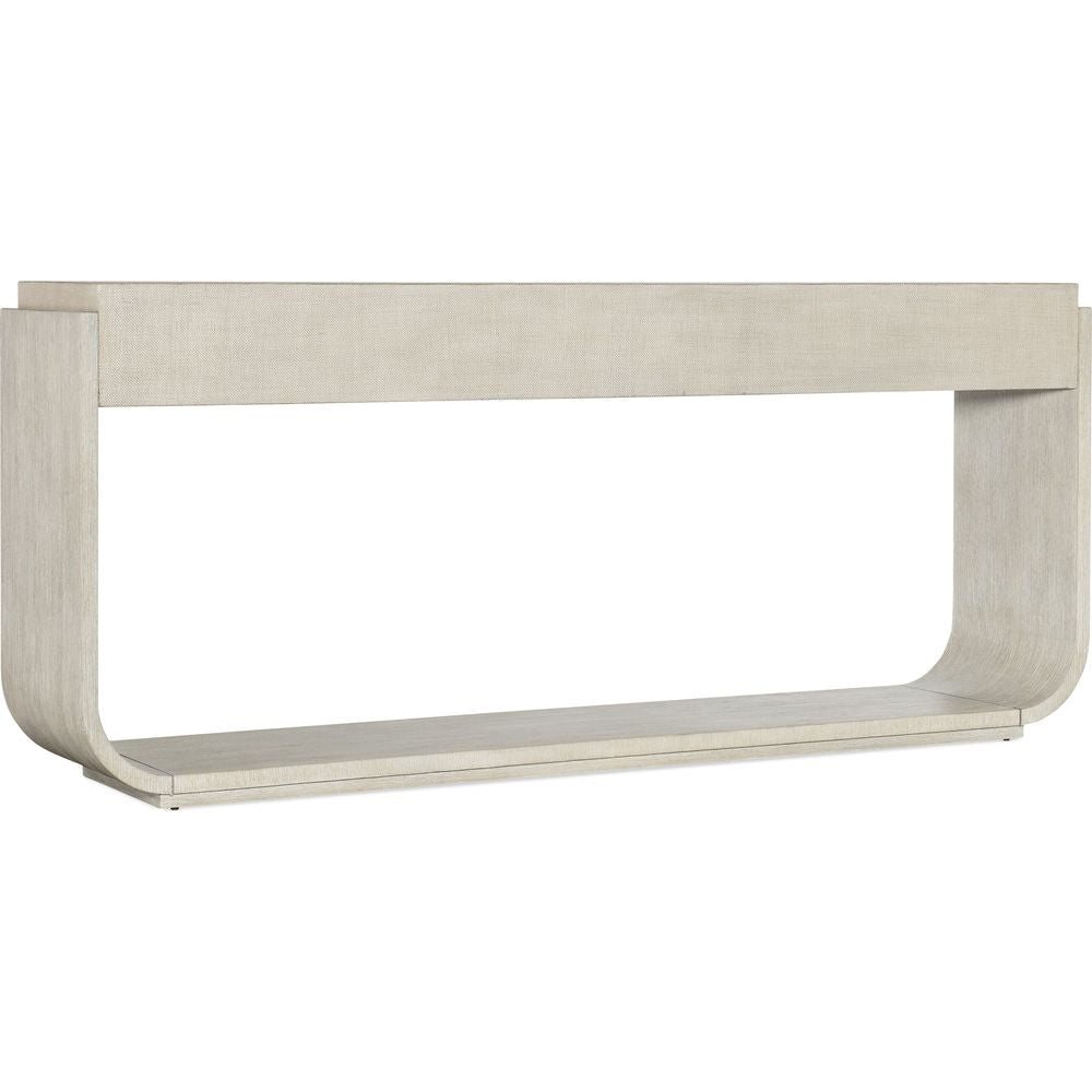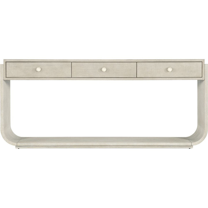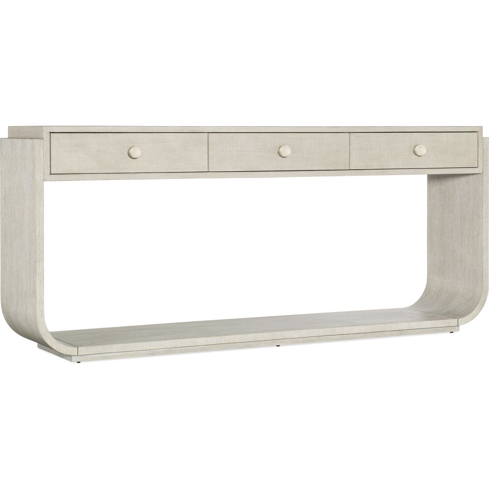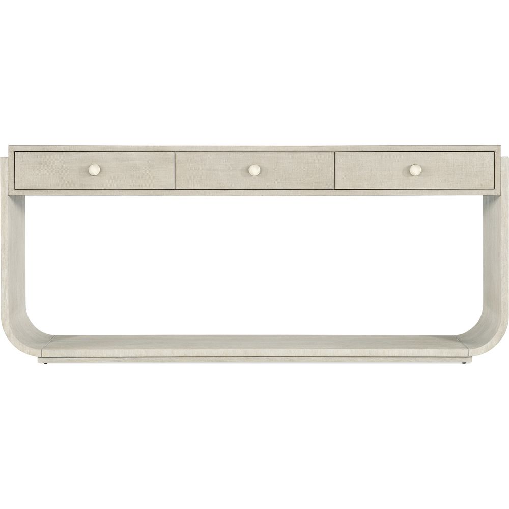 Description: Symmetrical and timeless with a luxe mixture of materials, the soft and sophisticated Modern Mood Console Table has a narrow rectangle shape with rounded sides and a raffia-wrapped drawer front and top. Crafted of Quartered Oak Veneers with wire-brush detailing, it is finished in the serene Diamond finish, accented by round knobs in a warm pewter finish wrapped in leather.