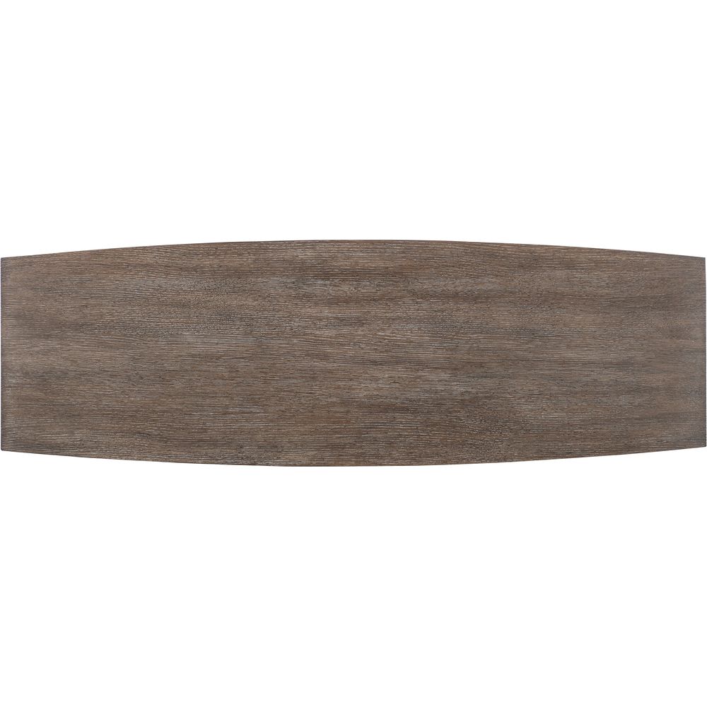 Description: Bold, organic and geometric, the Modern Mood Accent Table has a rectangular shape with a dramatic metal-wrapped circle base. Crafted of Quartered Oak Veneers and resin, it is finished in Mink, featuring wire-brush detailing with dark, earthy brown hues with notes of black for a soft sophistication.