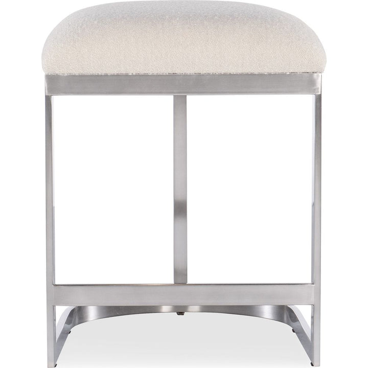 Description: Cozy chic meets sleek sophistication with the Modern Mood Counter Stool in a backless design. The tactile and textural Boucle fabric in Inverness Natural on the U-shaped upholstered seat contrasts with a brushed metal base, stretcher and foot rail in a warm pewter finish. Fully upholstered seat.