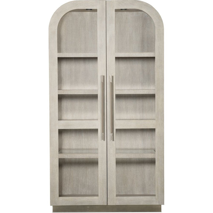 Description: Architectural and timeless with a luxe mixture of materials, the Modern Mood Arched Display Cabinet combines Oak Veneers, Metal and Glass in a stunning statement piece. Crafted of Quartered Oak Veneers with wire-brush detailing in the softly-sophisticated Diamond finish, the cabinet has two wood-framed tempered glass doors with soft-close hinges and magnetic catches. Behind the doors are two adjustable wood-framed glass shelves with plate grooves and two puck lights with a three-intensity touch switch on the right side of the back panel. The metal-wrapped base and the metal bar pulls are both in a warm pewter finish, and the bar pulls are accented with leather.