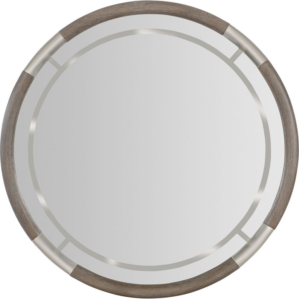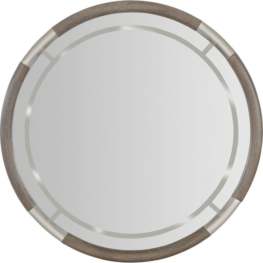 Description: In a timeless compass-like profile, the Modern Mood Round Mirror combines Quartered Oak Veneers in the Mink finish with wire-brush detailing and warm pewter metal accents for a striking focal-point piece.