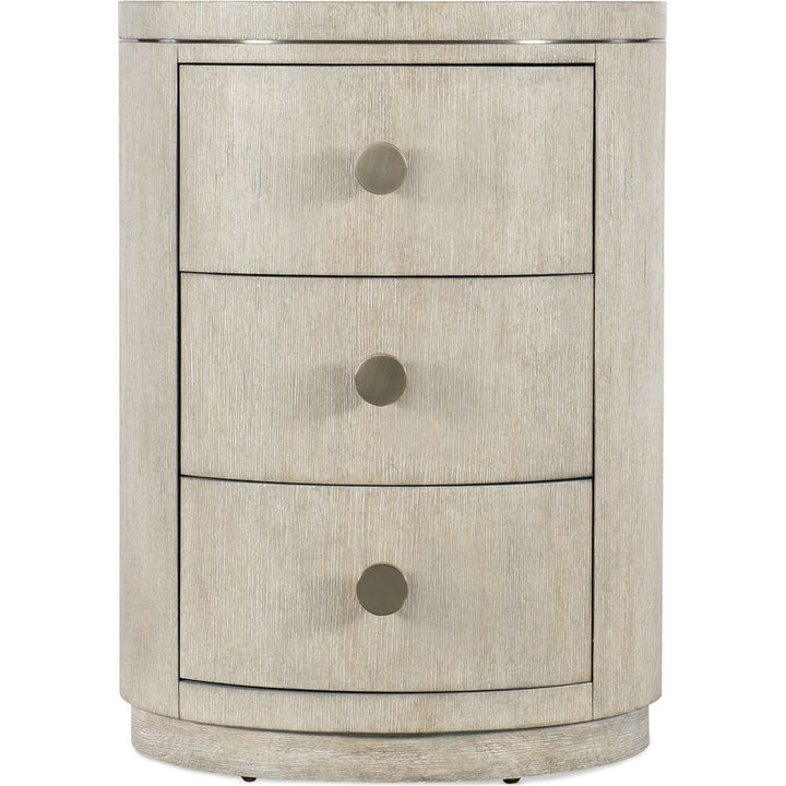 Description: Serene, symmetrical and softly-sophisticated, the Modern Mood Round Nightstand has a clean modern profile and luxe mixture of materials. Offering three self-closing drawers, the nightstand is crafted of Oak Veneers in a crystal-like Diamond finish and has a striking matched veneer top. With metal trim, the knobs are accented by leather.