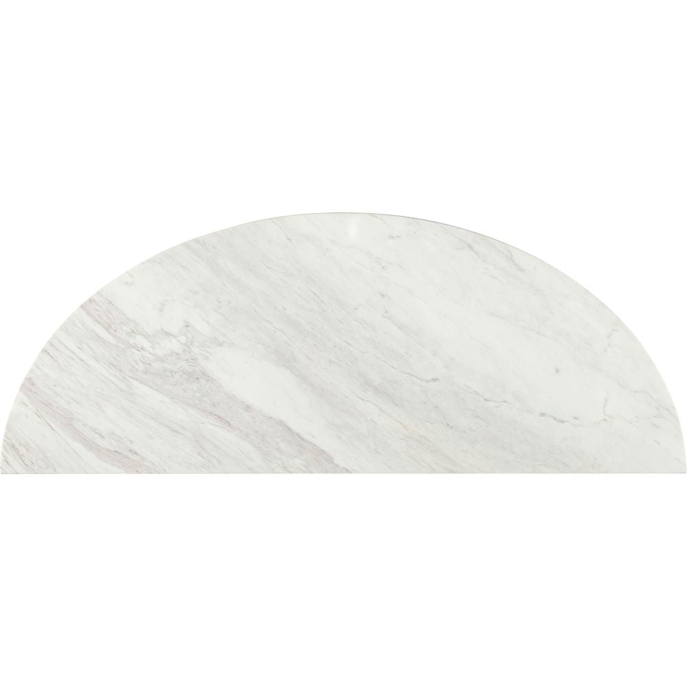 Features: Demilune shape; Two self-closing drawers; Levelers; Metal frame and legs; White and gray marble top