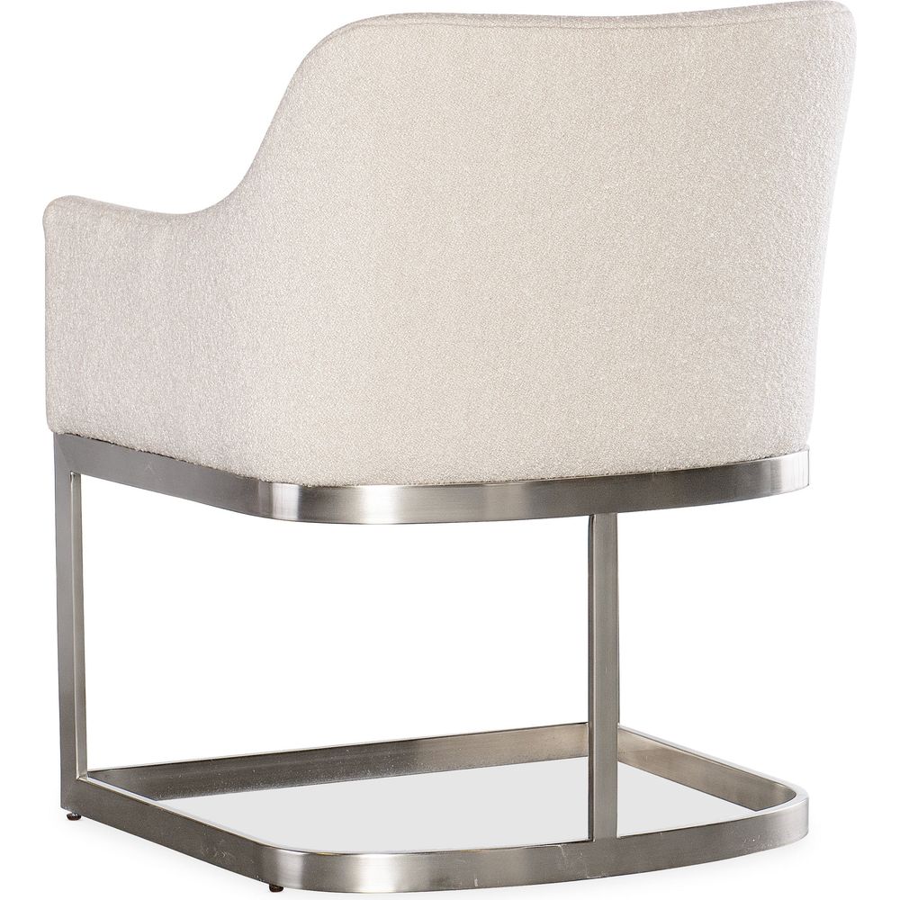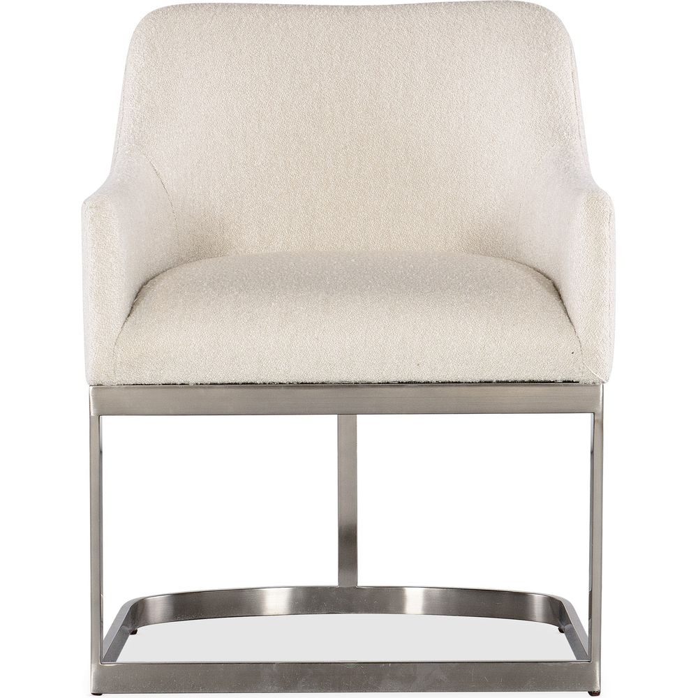 Description: Cozy chic meets sleek sophistication with the Modern Mood Upholstered Arm Chair. The tactile and textural Boucle fabric in Inverness Natural contrasts with a brushed metal base in a warm pewter finish. Fully upholstered seat, back and arms.