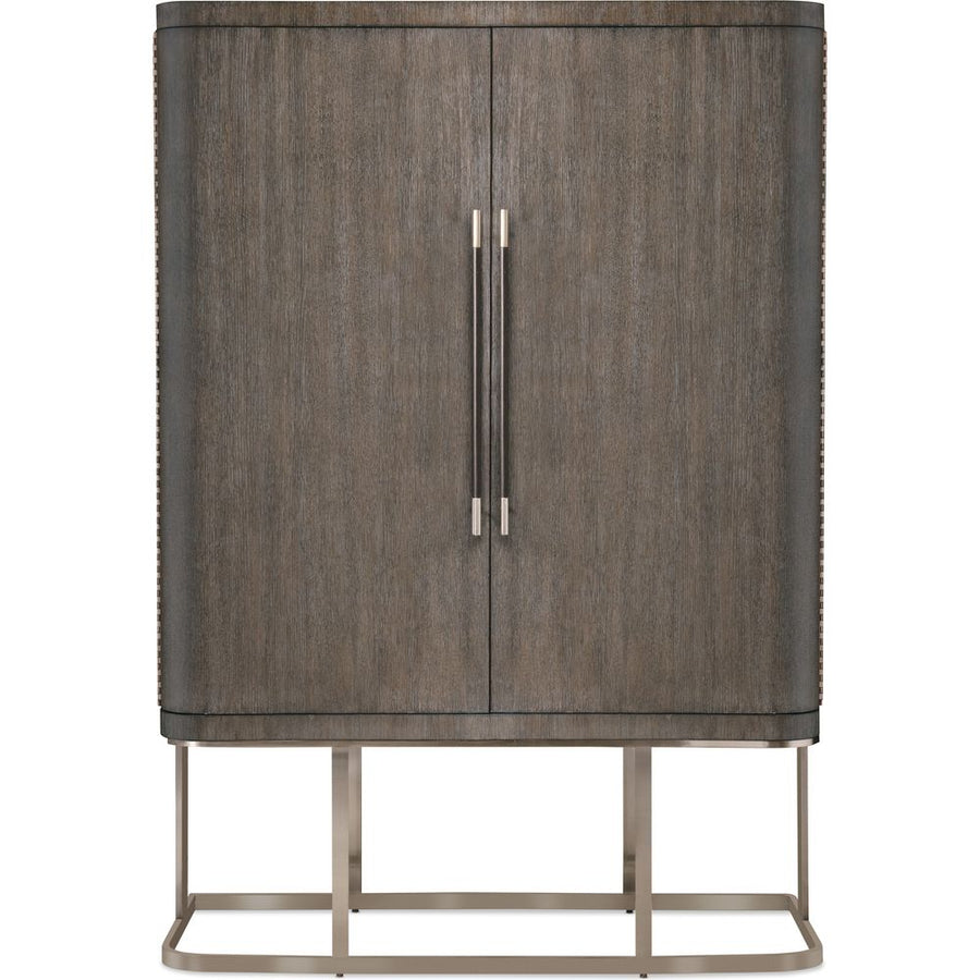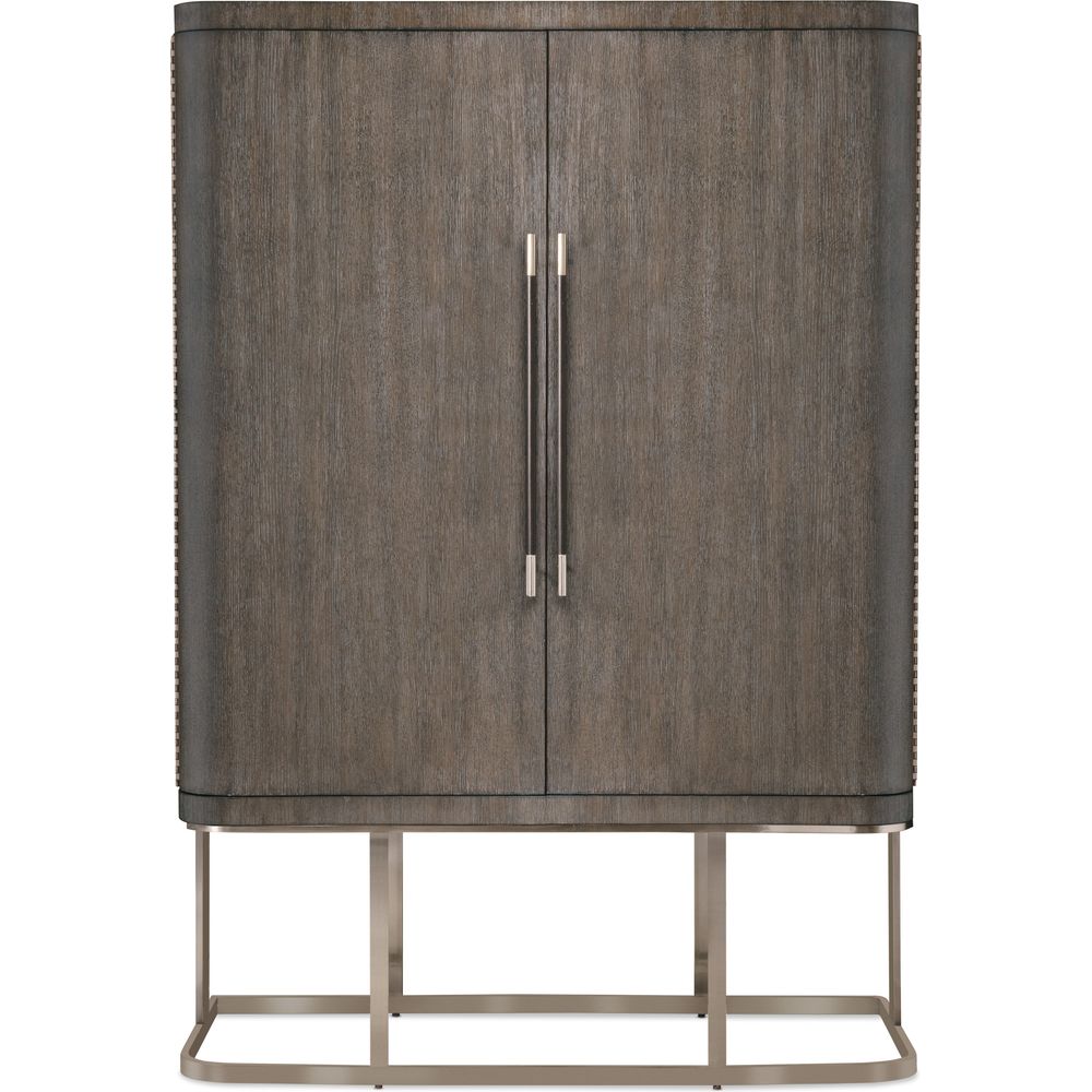 Description: Architectural and timeless with a luxe mixture of materials, the Modern Mood Wardrobe is a statement piece. The shaped metal base gives the cabinet a floating appearance. Crafted with Oak Veneers, the wardrobe is finished in a dark Mink color and has two large wood doors with piano hinges and mirror glass on the back of the right-side door. Behind the right-side doors are two adjustable shelves. Features include six self-closing drawers, a removable clothing rod and jewelry storage behind the left-side doors that includes 26 hooks, three felt-lined trays and one removable drop-in jewelry tray with four padded rows for rings.