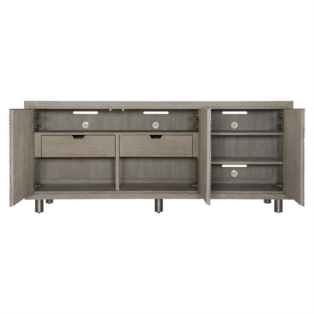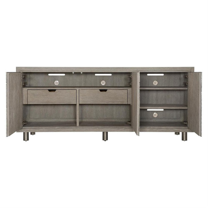 - Behind paired left and center doors are two soft-close drawers with one compartment with vents and covered grommets above the drawers, and one compartment beneath each drawer