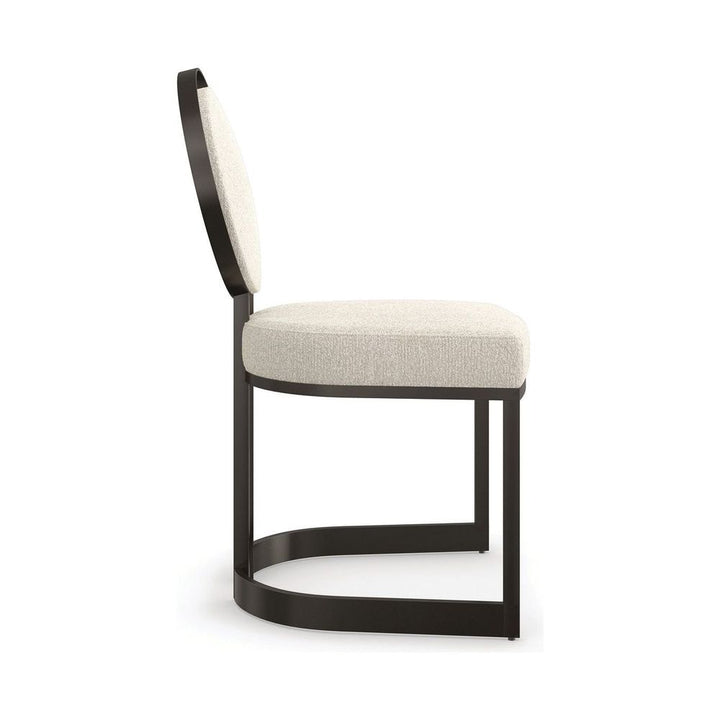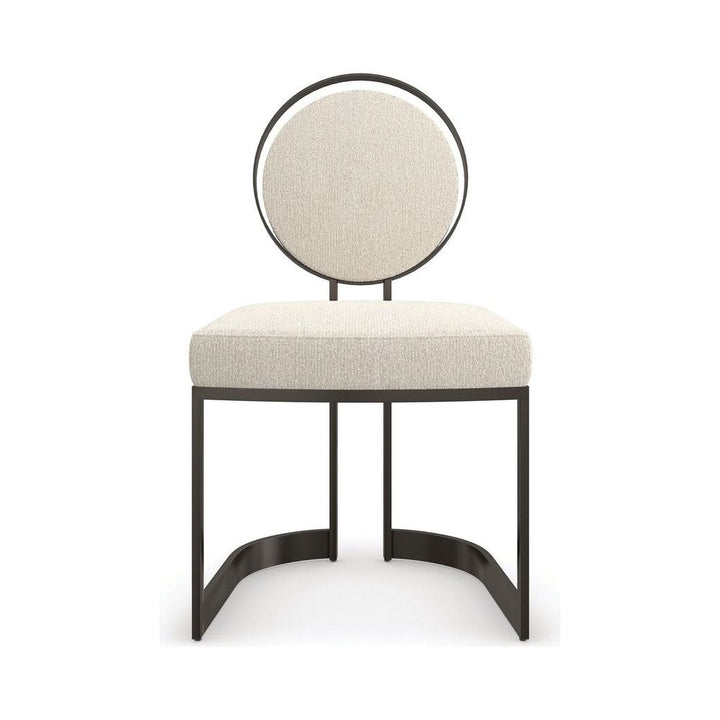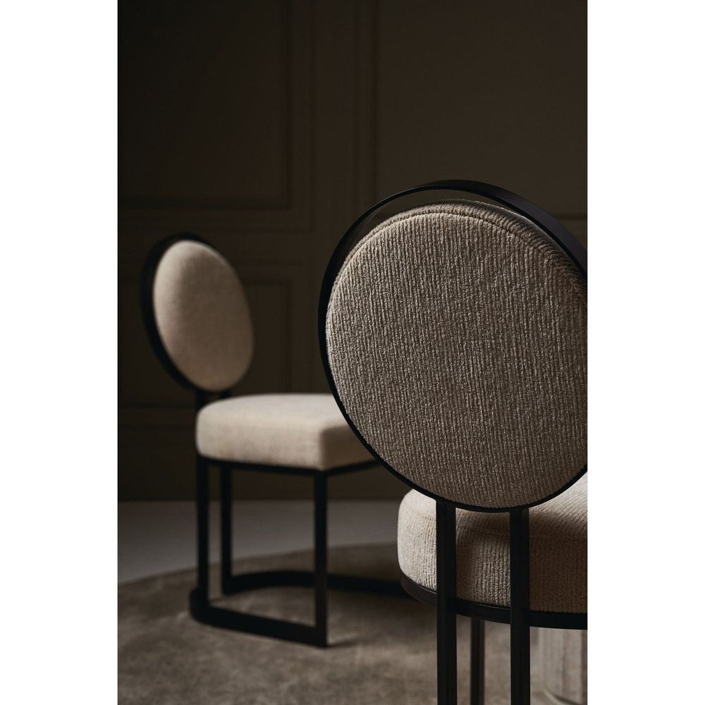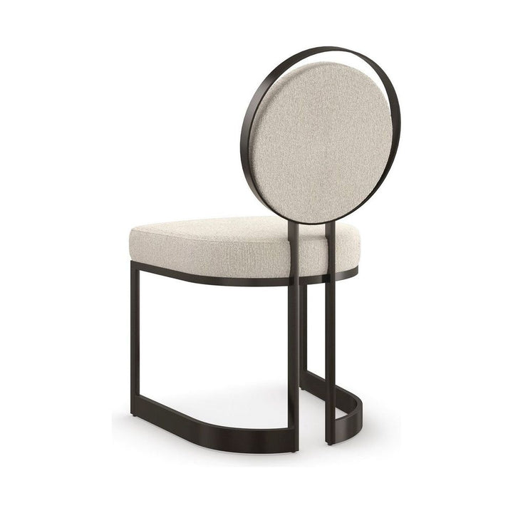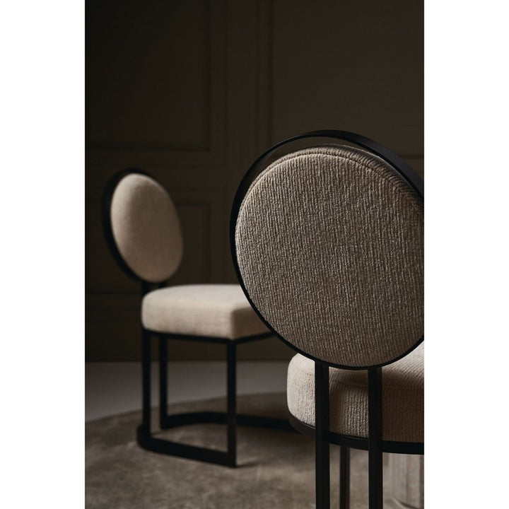 This sculptural metal chair lends an artful element to dining interiors, with a seemingly floating upholstered back set inside a metal circle. A sliver of space around the edges evokes phases of the moon and mimics its crescent-shaped frame. A tactile ivory fabric is welcoming to the senses and in dramatic contrast to a rich, Chocolate Bronze finish.