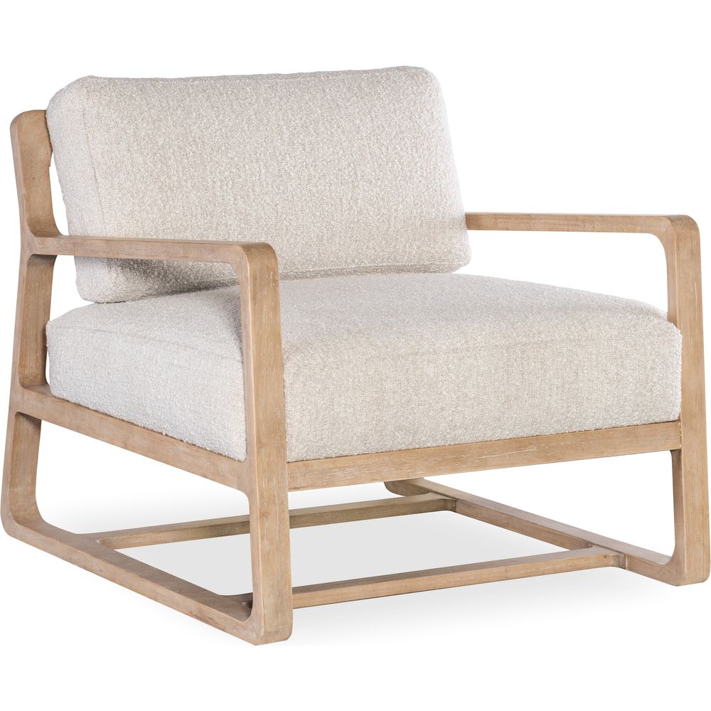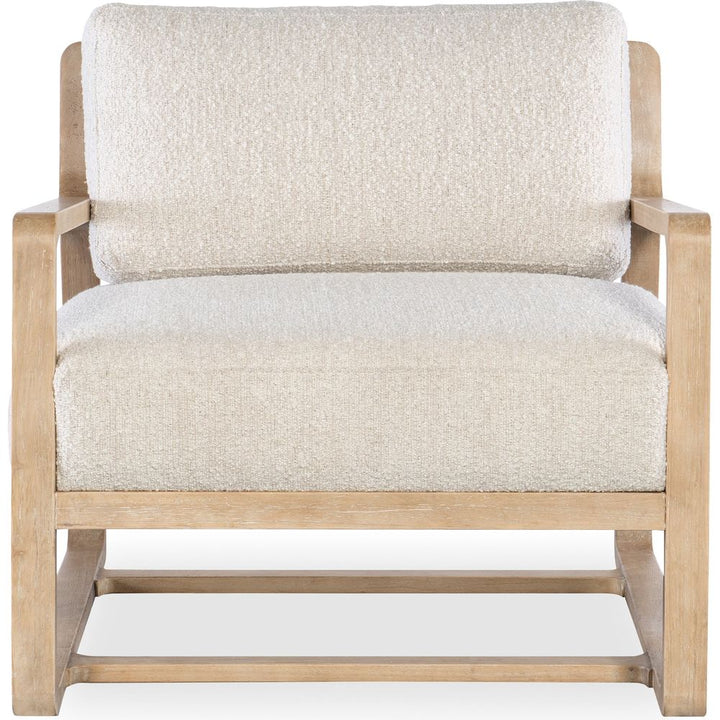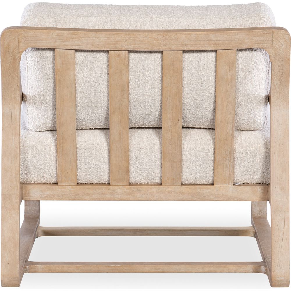 Description: Chunky, chic and oh-so-comfy, the Moraine Accent Chair has an exposed wood frame, slat back and stretchers, along with a plush fabric seat and loose back pillow. The airy finish is Dune, light as sand and smooth as a shore after a receding tide, transparent by design to showcase the unique grain patterns of the flat-cut cathedral oak veneers.