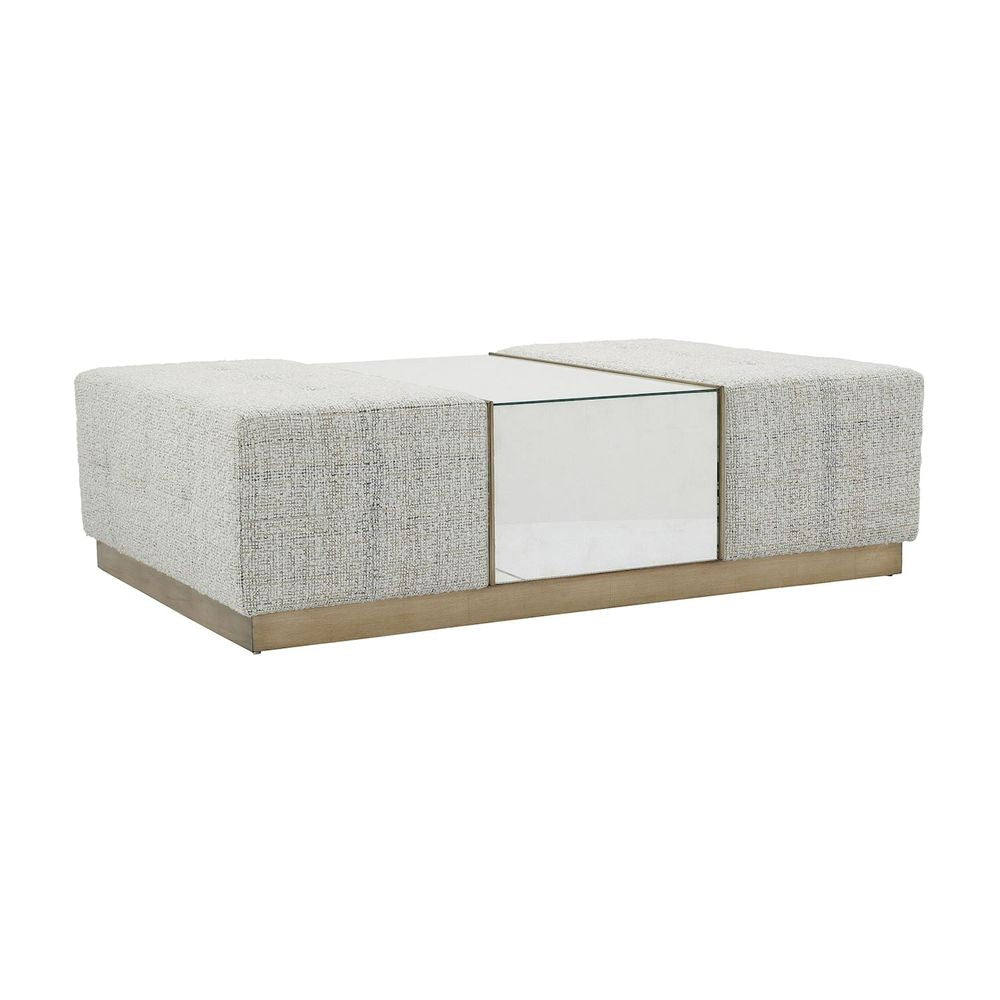 The Mountain City Cocktail Ottoman is a seamless marriage of utility and lavish style. Crafted from beech wood, the piece showcases leather upholstery in Riggs Mineral 4071 fabric, accented with trim in Gimlet String 1120. A plinth base in an opulent Valyrian Gold finish, serving as a wonderful highlight to the eglomise tabletop.