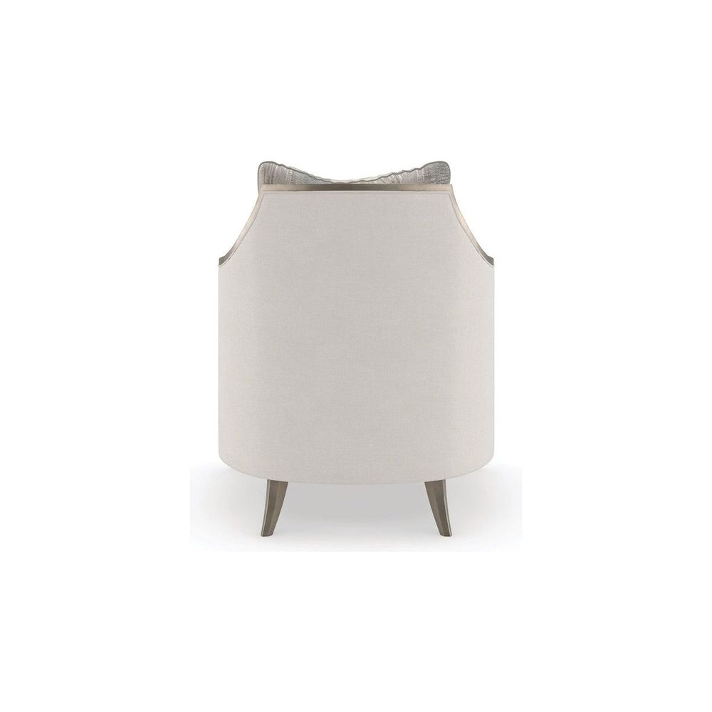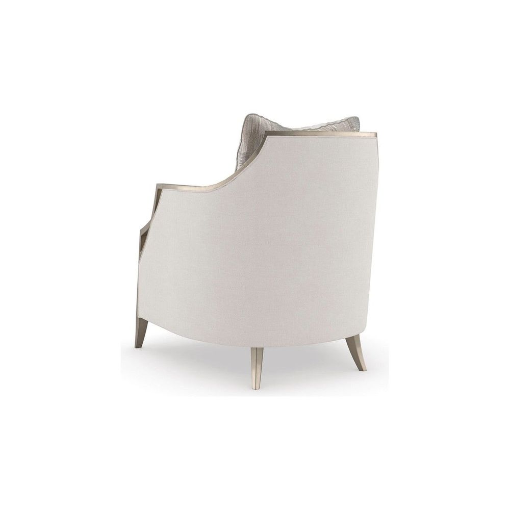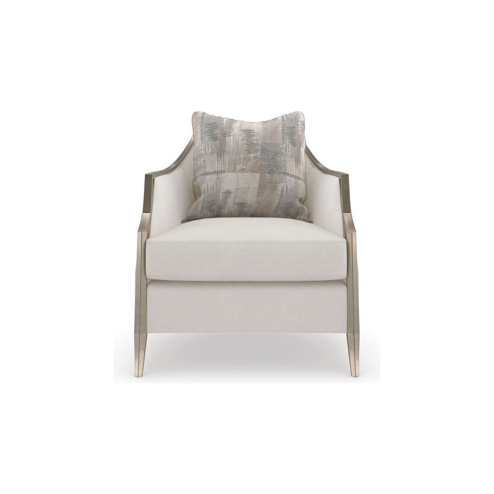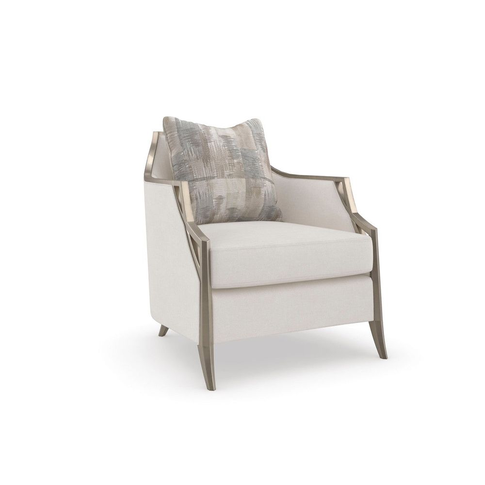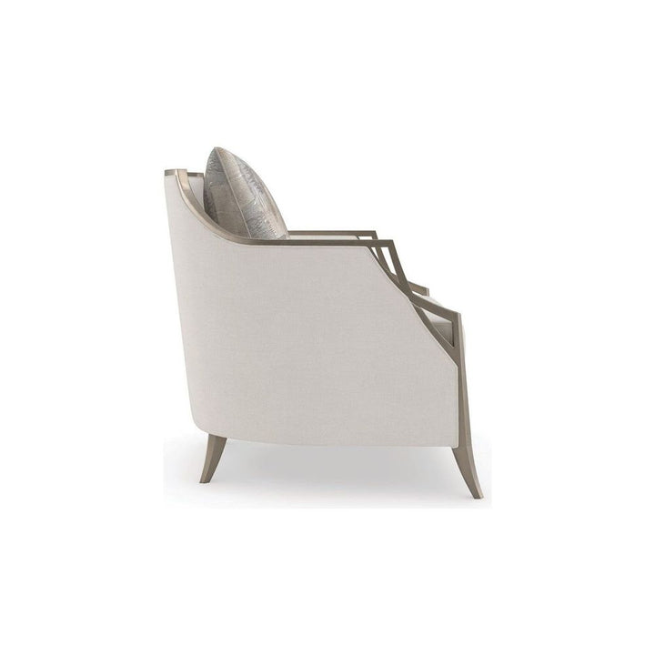 Eloquently mixing classic and contemporary design details, this occasional chair makes an elegant statement. A metallic Charcoal Leaf finish accentuates its wood-trimmed silhouette, made modern with a carved crisscross pattern that draws the eye to sloping arms and splayed legs. Dressed in a herringbone performance fabric with a luxuriously soft hand and finished with a feather-down toss pillow in a shimmering embroidered fabric. Style with our X Factor sectional or use a pair to create an intimate space for conversation.