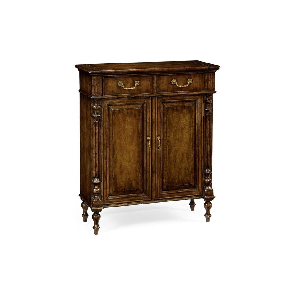 Small narrow planked walnut cabinet with light distress, having two drawers above twin doors and a shelf within, engaged turned columns to the sides raised on turned baluster legs. After a Victorian design of c.1870.