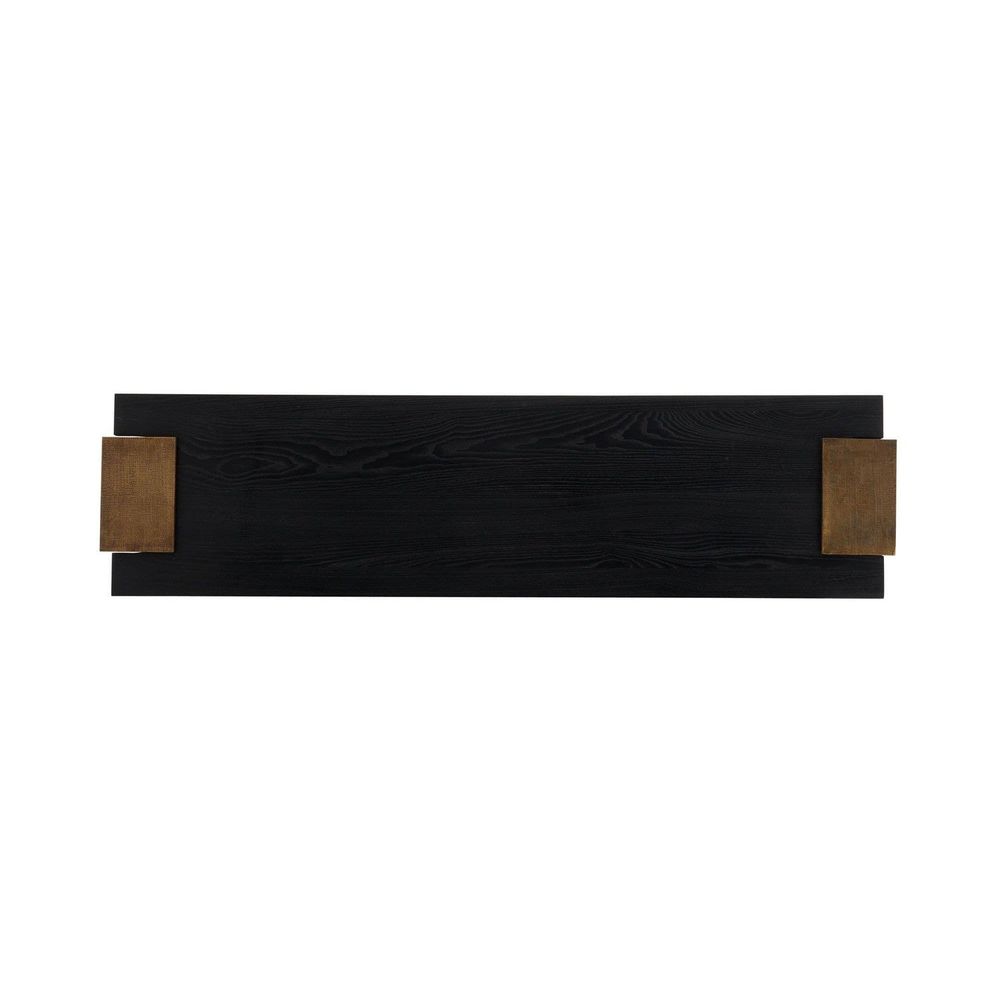 Architectural and minimal, the Natalya console exhibits is rooted in elements of industrial-inspired design. An ebony finished oak wood top showcases a bold and sculptural silhouette. The legs clamp over the tabletop's edges clad in antique brass for a highlighted accent. Wood and clad finish will vary.