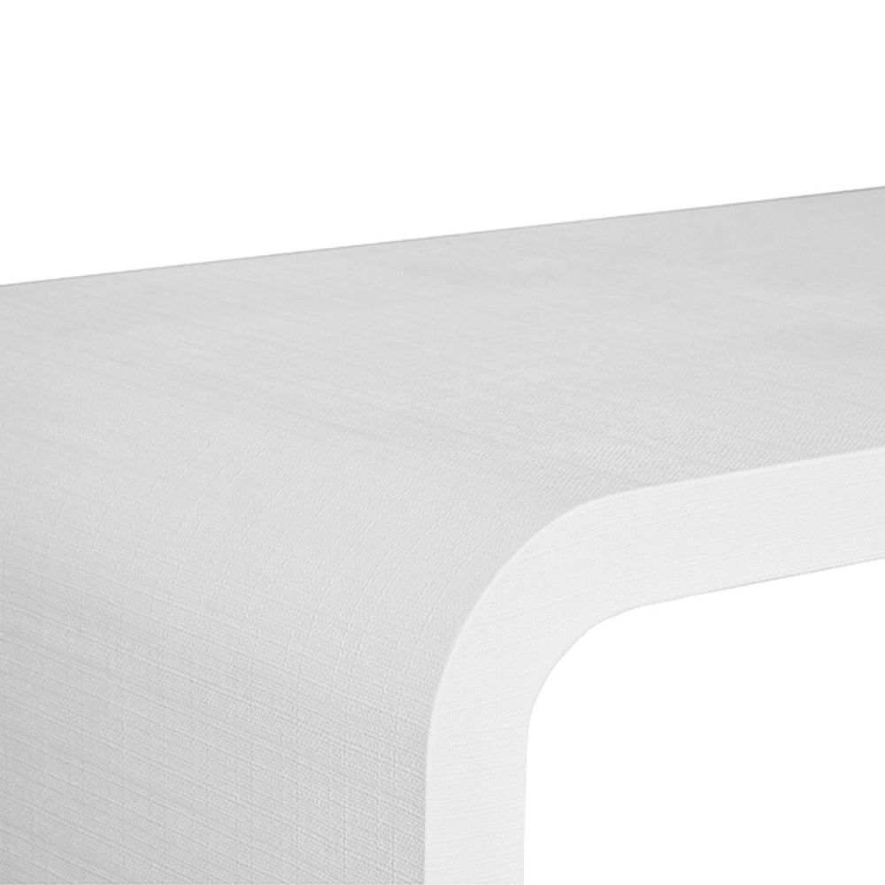 Description: WATERFALL EDGE COFFEE TABLE IN TEXTURED WHITE LINEN