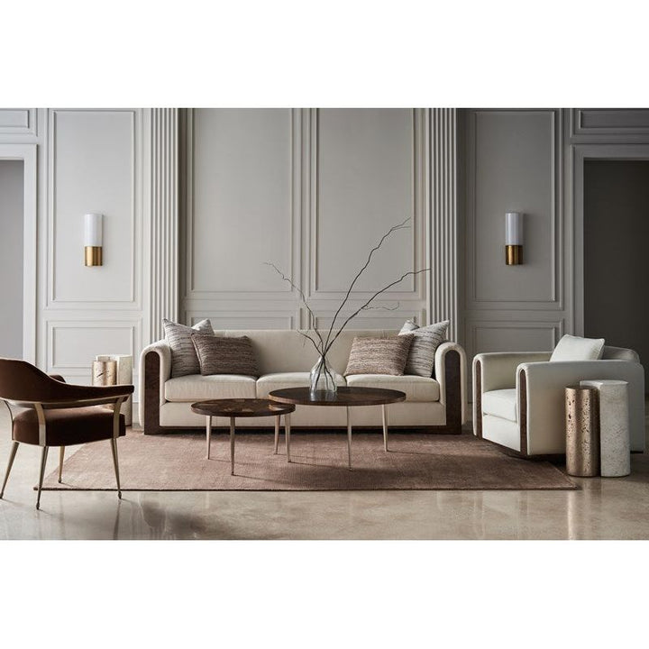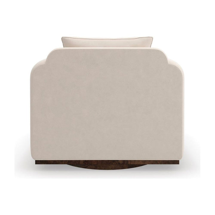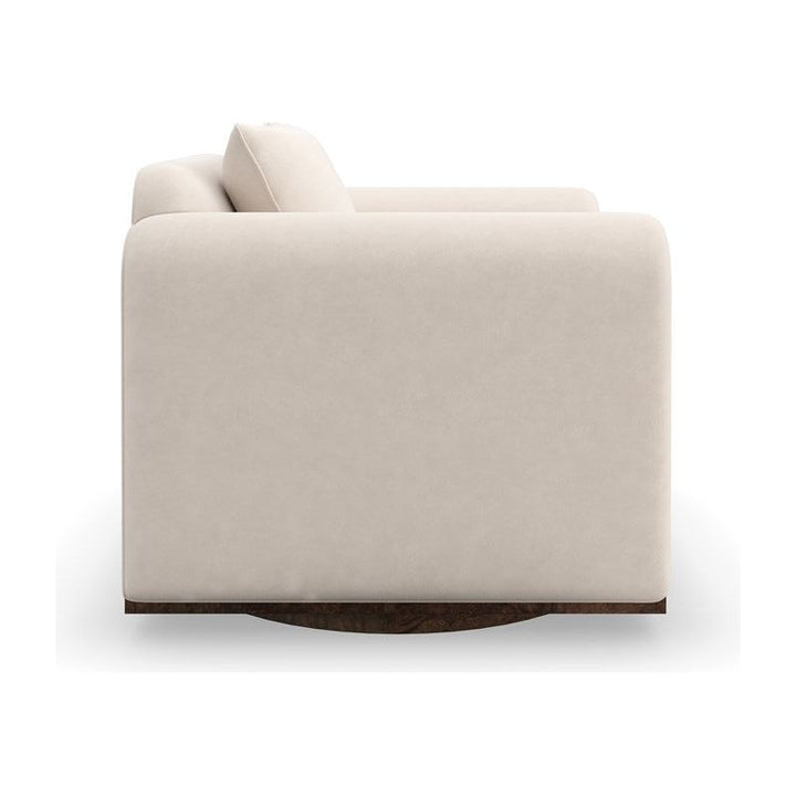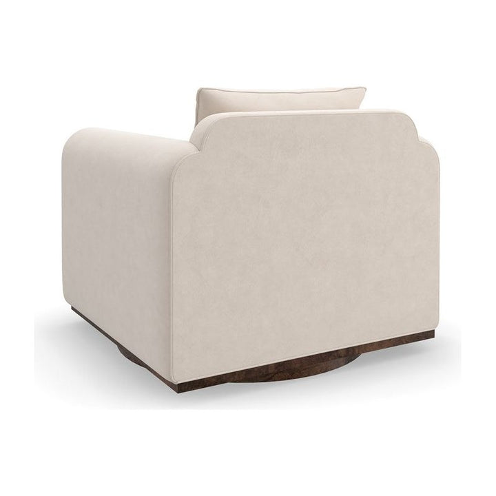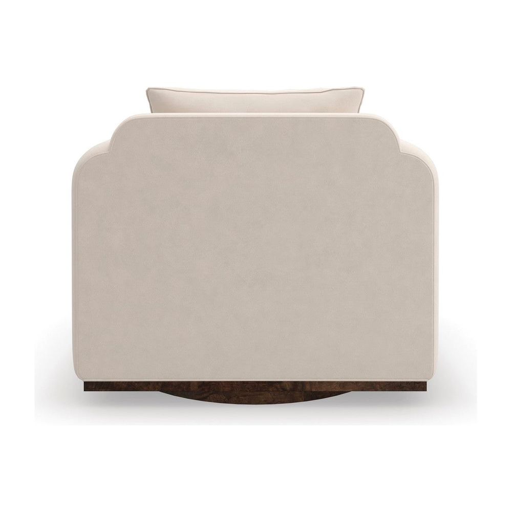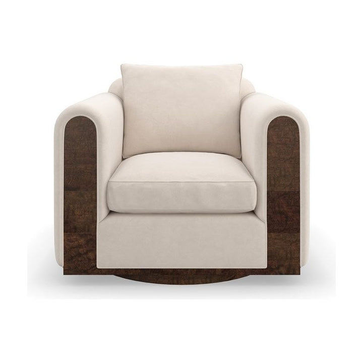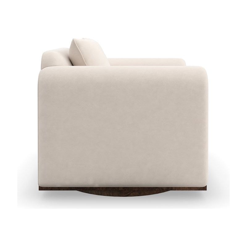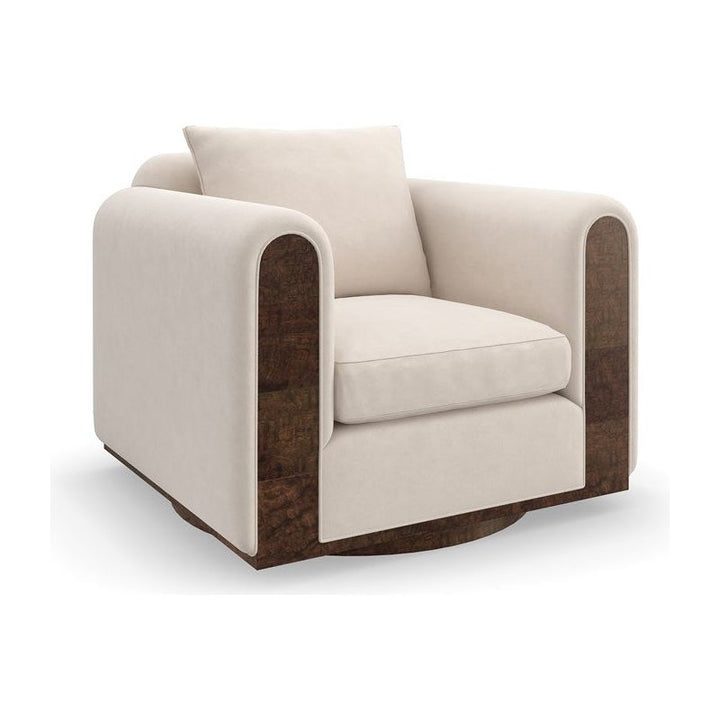 A stand-alone swivel, or companion to our Dimitri sofa, this generously scaled lounge chair adds a sense of harmony and organic fluidity in an eggshell-colored, faux angora velvet. An inset of Galway Mappa Burl accentuates gently rounded track arms, flowing down and around its circular base.