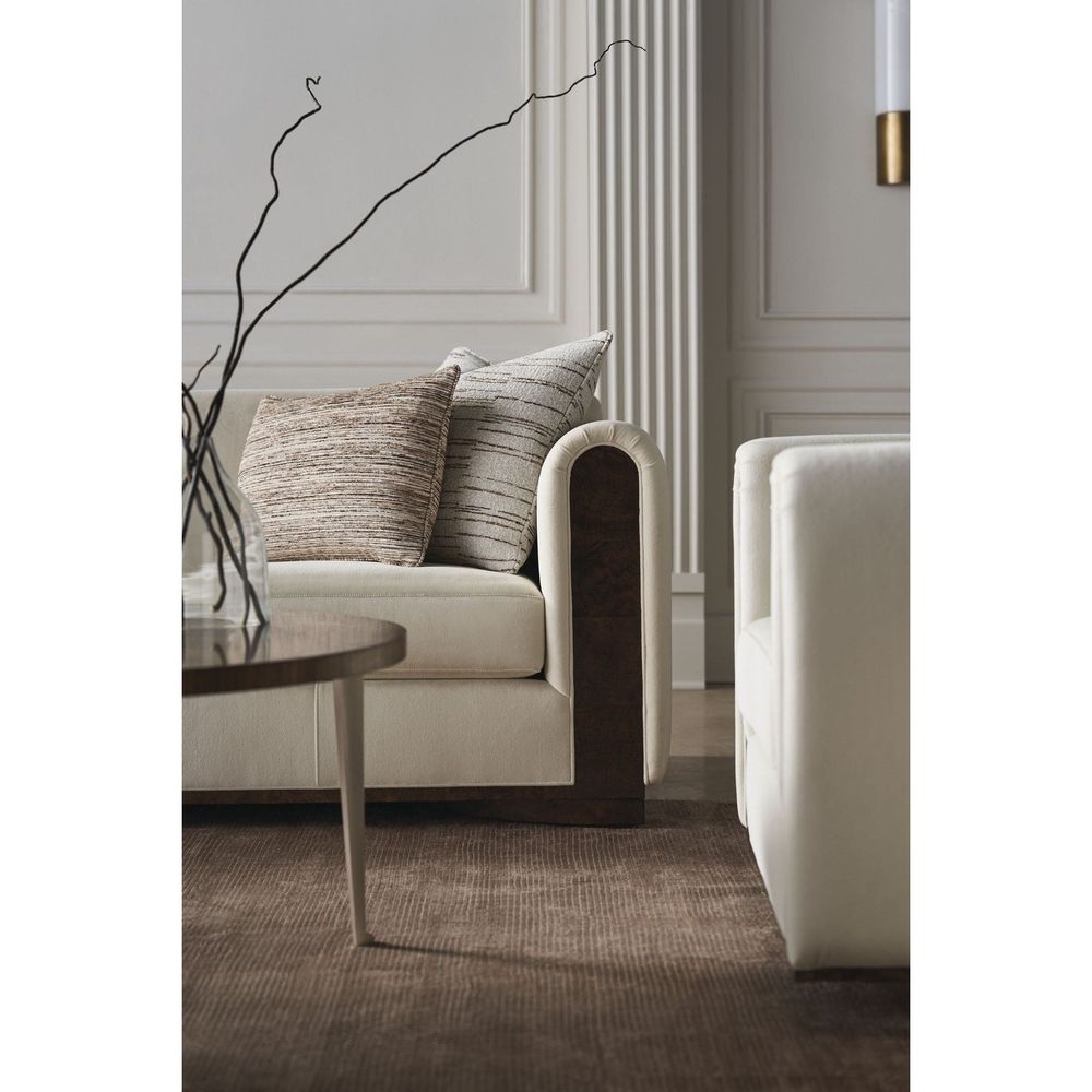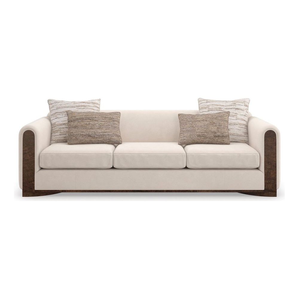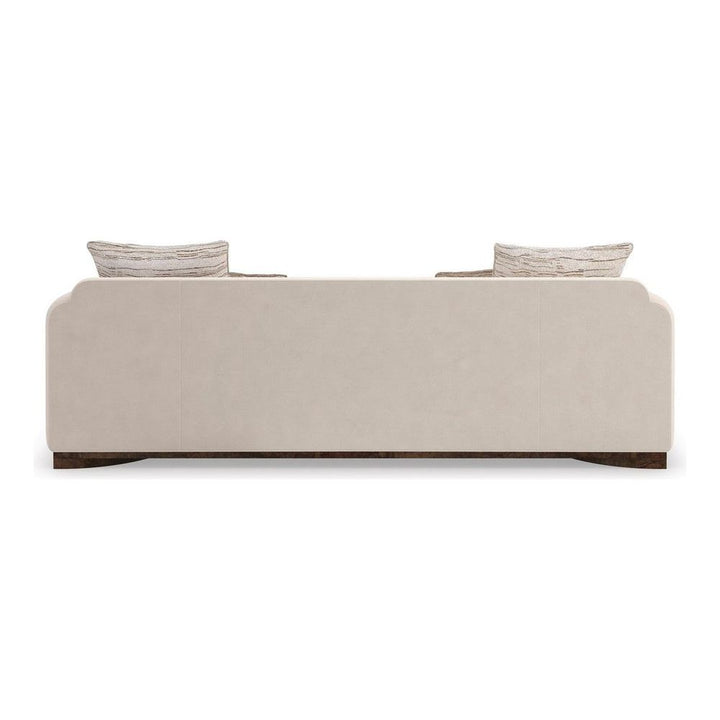 Meticulously tailored in an eggshell-colored, faux angora velvet, the Dimitri Sofa introduces generous seating in a harmonious mix of textures and materials. An inset of Galway Mappa Burl accentuates gently rounded track arms, flowing downward to where it recedes along a semicircular plinth base. Rectangle and kidney-shaped silk toss pillows add depth and tactile layering in a fashionable pattern.