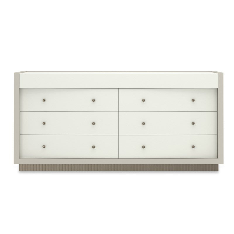 The Calais Dresser flawlessly mixes shapes into an eight-drawer dresser with clean lines. The outer rectangular case is finished in Rockport Grey Adobe with a top in Almond Milk. Set slightly inside the outer case are bow-front drawers in Almond Milk, six of which have soft-close under-mount guides and small ball-pulls in Brushed Gold. The top drawers open with a thin top finger-groove. The dresser's base features reed molding completed in Ombre Warm Silver Leaf. pieces are known for their hidden special touches. This piece includes a removable jewelry drawer lined in Ivory felt.