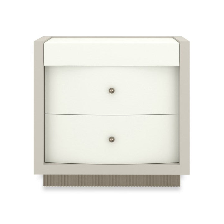 Adding Calais Nightstands to a room with a Calais Dresser will enhance your vision for a room with modern French sensibilities. The outer square case is finished in Rockport Grey Adobe with a top in Almond Milk. Set back in the outer case are two bow-front drawers in Almond Milk which have soft-close under-mount guides and small, ball-pulls in Brushed Gold. The nightstand's base features reed molding completed in Ombre Warm Silver Leaf. Like other pieces, Calais has hidden openings for power cords.