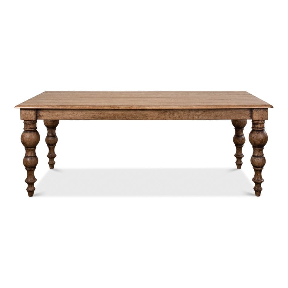 Conspicuously large turned legs support this 84" table. The top has joinery and edges that have ogee carving. It is 31" high.