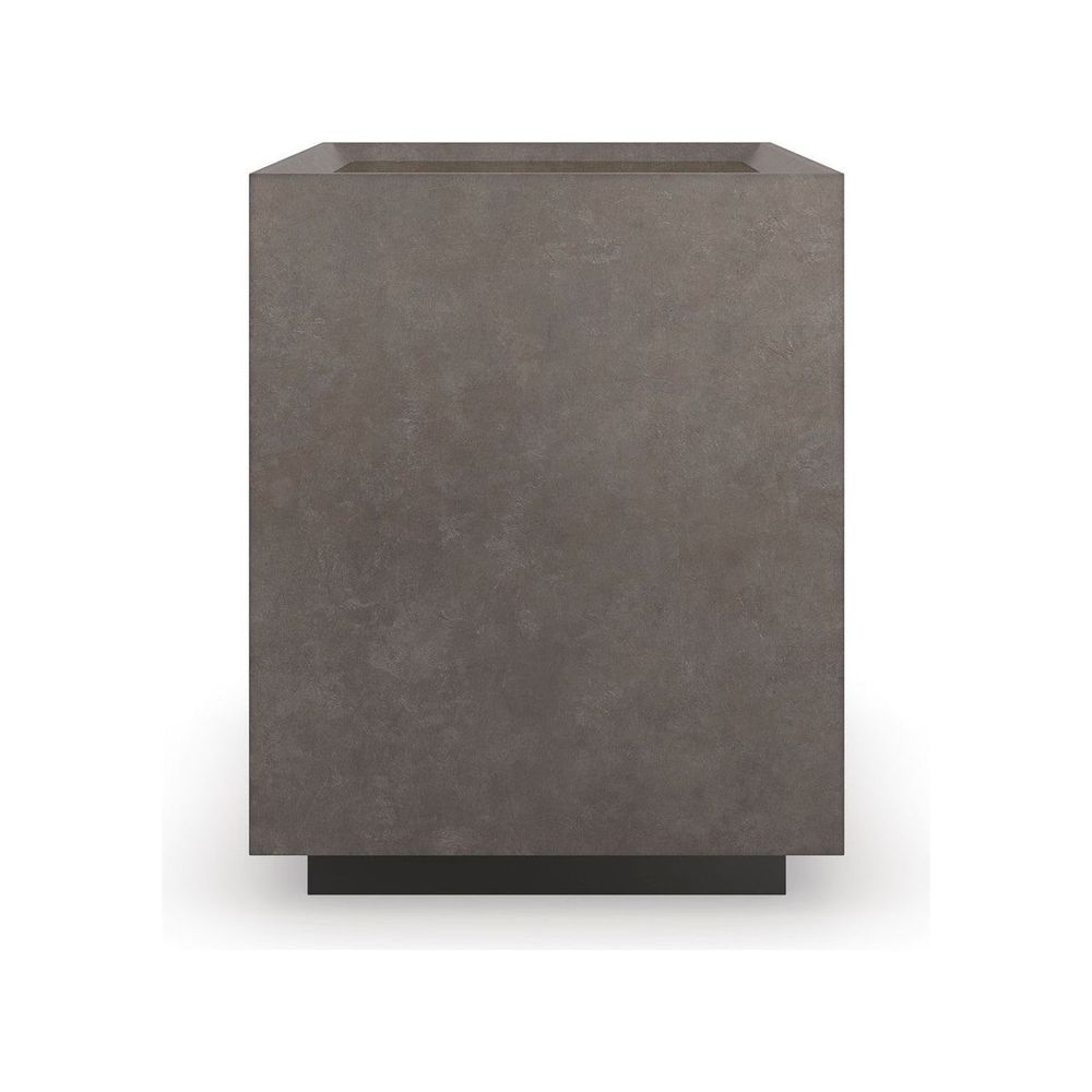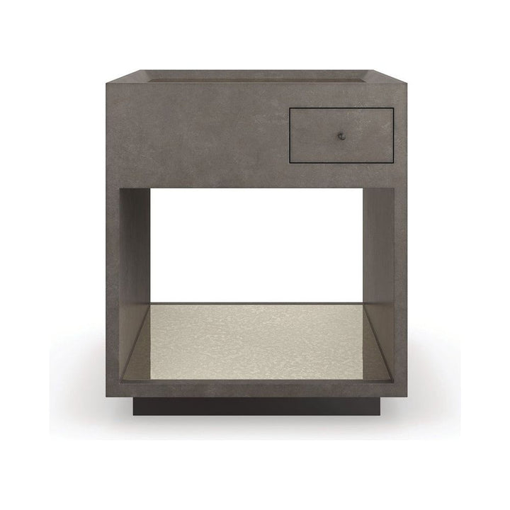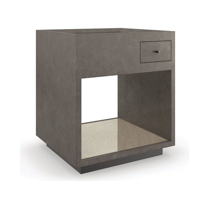 An alluring mix of materials and finishes elevates this end table, featuring a simple square shape and open space for storage and display. An antique mirrored top and shelf creates a sense of depth and warm reflection, complemented by an overall broken leaf finish for tactile appeal and added shimmer. A single, asymmetrical drawer with recessed finger pulls offers a tucked-away place for minimizing clutter.