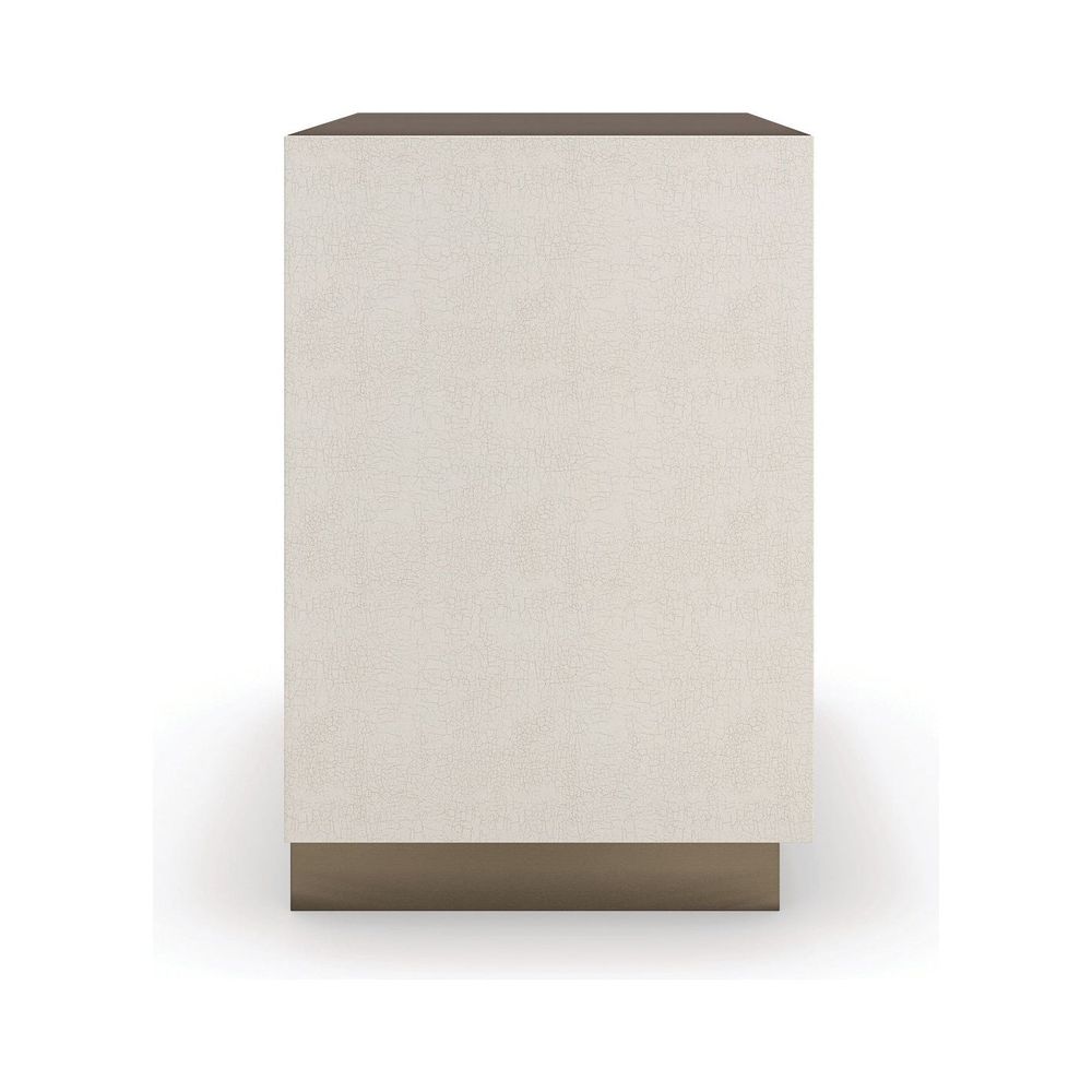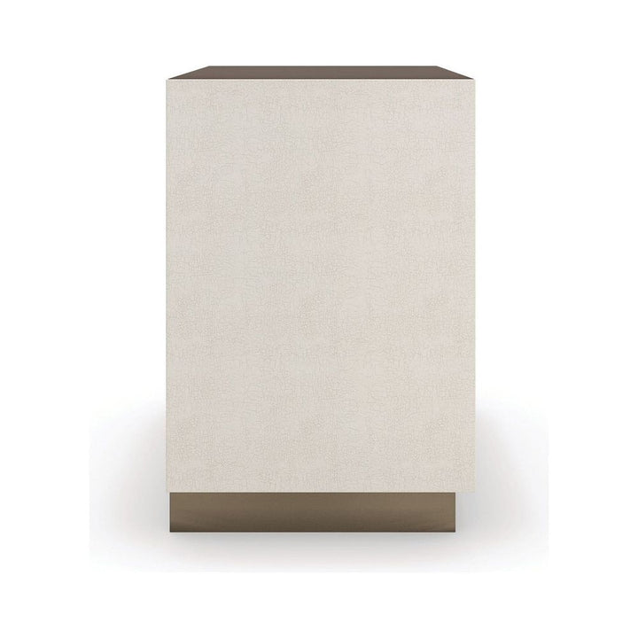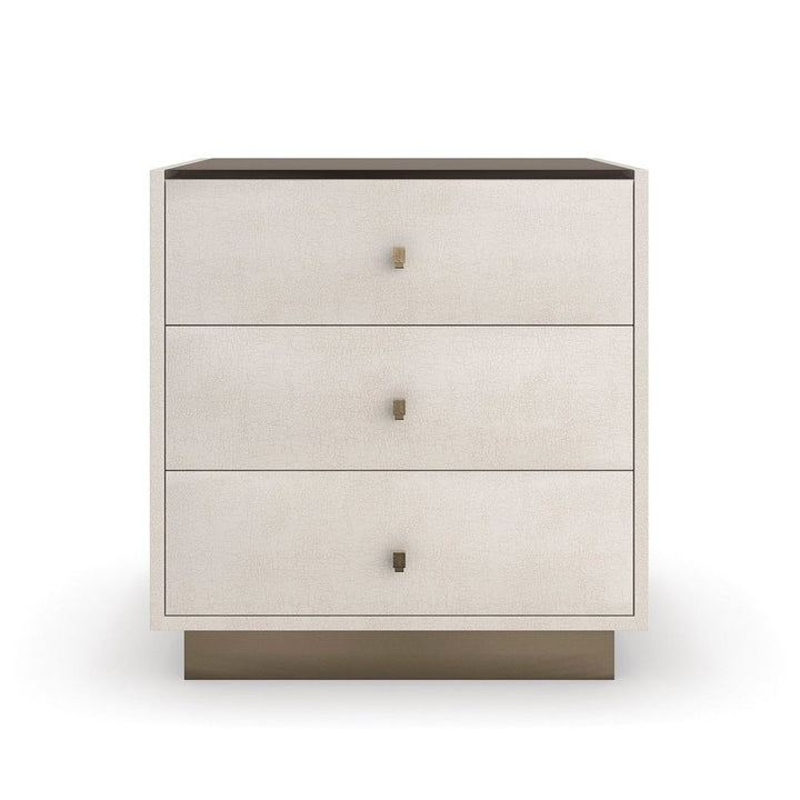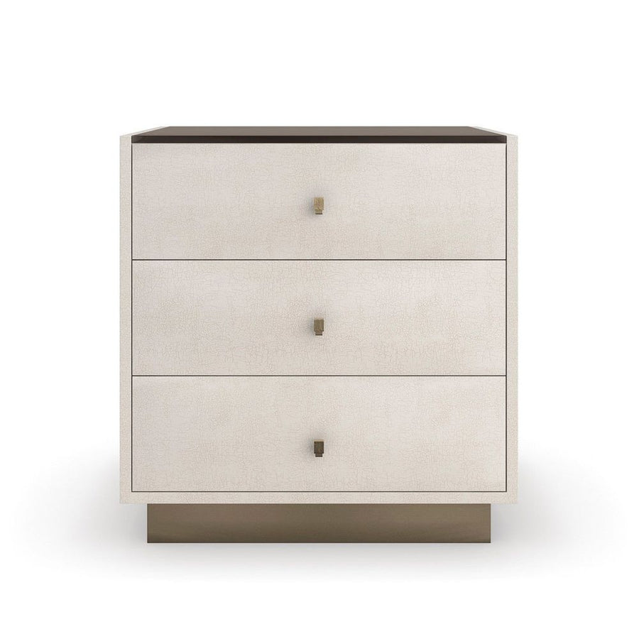 Named for Homer's timeless epic poem, this small-scale nightstand celebrates materiality and simplicity in form. Features an Ivory Craze crackle finish and smoked bronze glass top with three soft-close drawers balanced on a metallic plinth base. Brushed Gold pulls with a ripple detail add tactile appeal and a luxe finishing touch.