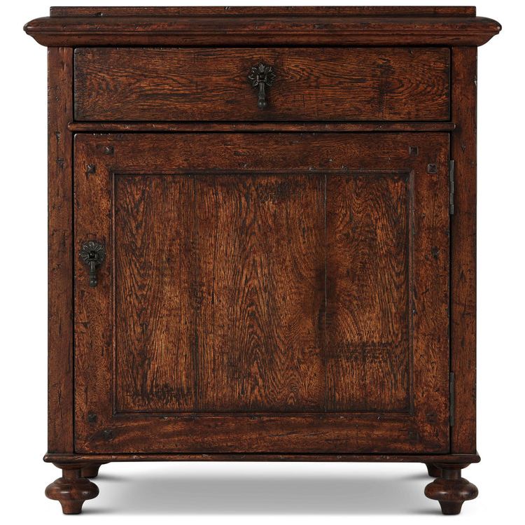 A rustic oak veneered bedside table featuring a moulded oak top above a frieze drawer and cabinet door with bronze finished pendant handles and finely turned feet.Theodore Alexander is shaped by English Heritage handcrafts furniture and accessories for your home with uncompromising quality. They also believe that the person who owns a piece of Theodore Alexander Furniture should take comfort in knowing the item can be viewed from any side and they have made the piece by using a time-honored, handcrafted method that is the true mark of high quality. Every piece of Theodore Alexander has a story just waiting to be shared.