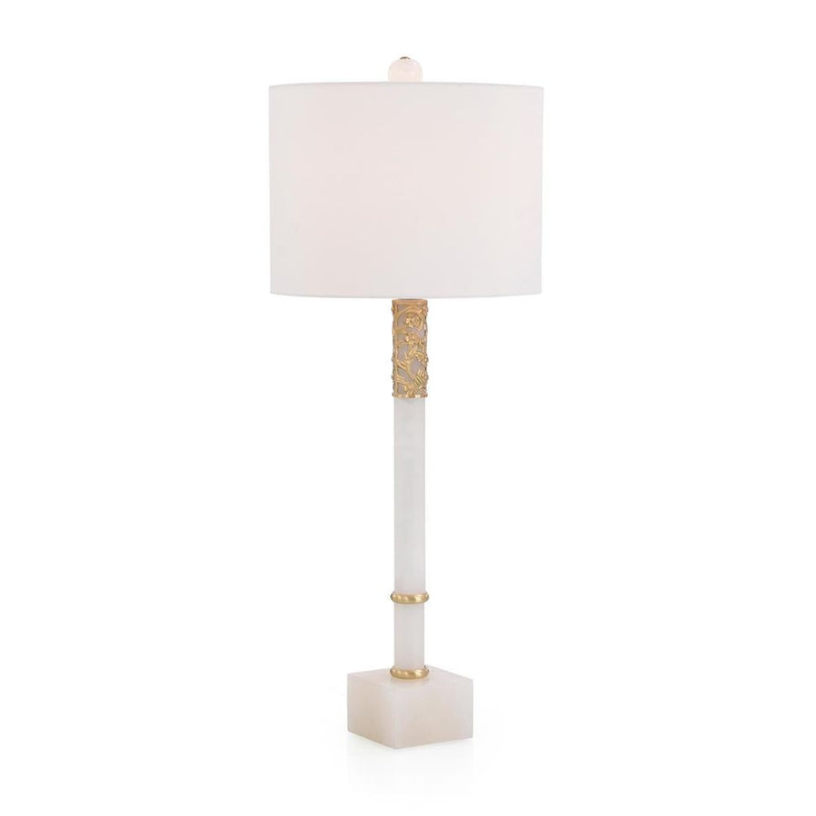 An elegant white alabaster table lamp is embellished with a brass flower filigree.
