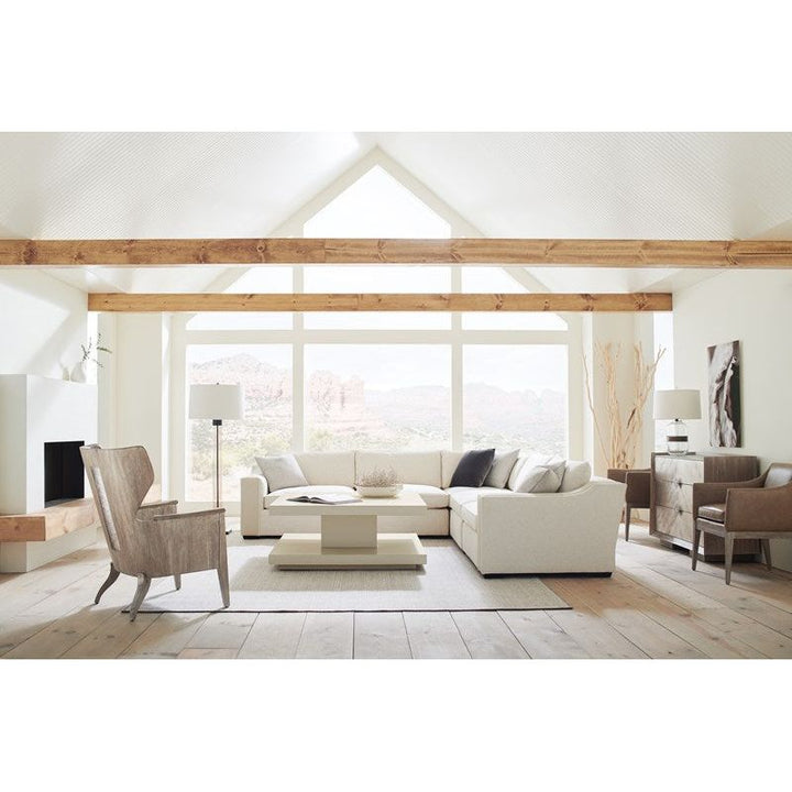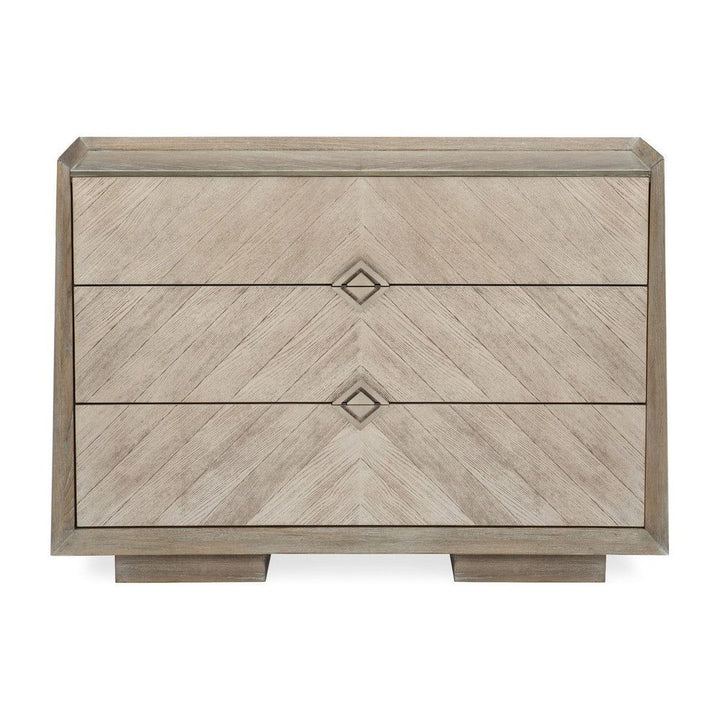 Reflecting the modern organic beauty found only in nature, this remarkable chest lends authentic character to a space. Its simple silhouette is accentuated by perfectly matched directional wood grain veneers that create a one-of-a-kind chevron pattern. An easygoing shade of Ash Driftwood highlights the stunning wood grains featured along its exterior while a Silver Driftwood finish brings out the beauty of the woodgrain pattern on top. A metal bead in Sundance Gold outlines the top and adds another touch of reflectivity while geometric drawer pulls and block feet give it substantial presence.