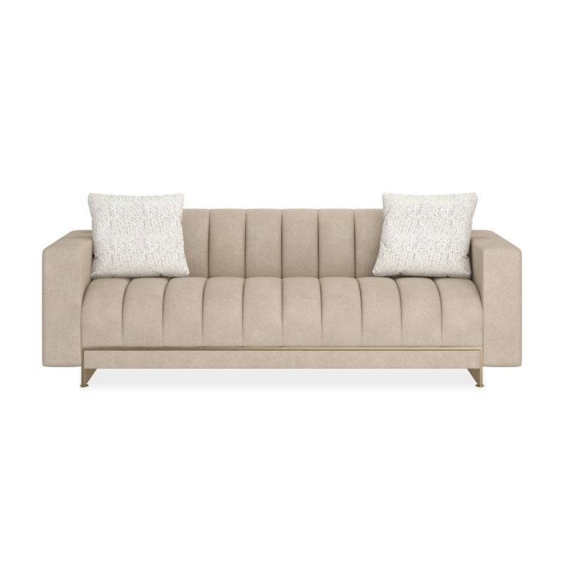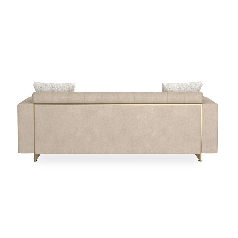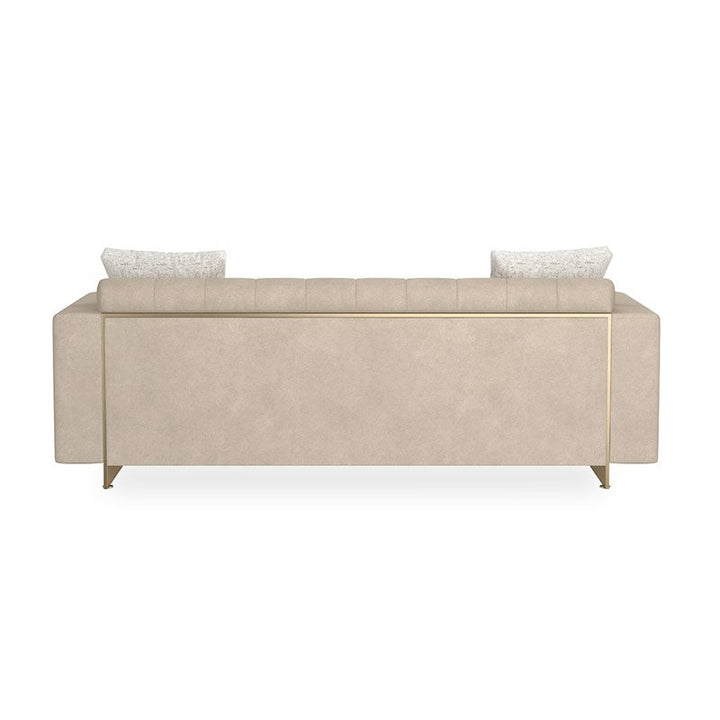 The Well-Balanced Sofa was inspired by Italian design and offers beautifully tailored channel tufting in a luxurious basketweave fabric in a shimmering Moonstone hue. This stylish vogue detailing and cosmopolitan silhouette makes this sofa the perfect focal point to build a spectacular room around in whichever chic city you're in across the globe. A tailored, thin gold detail is incorporated into the sofa frame. Its squared arms are the perfect height for resting or reading. Suspended off the ground by a continuous Whisper of Gold framework, this sofa appears to be lighter than air. This sofa's sophisticated lines look beautiful when floating in an interior.