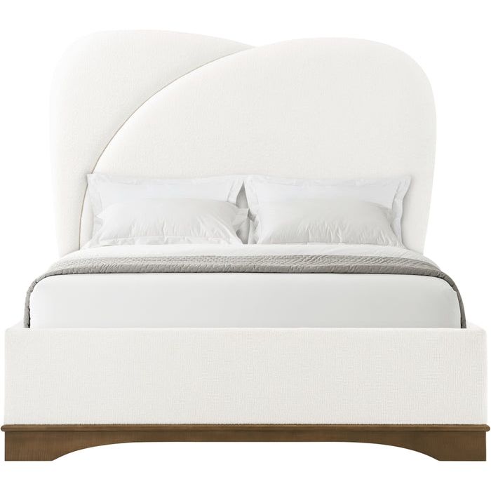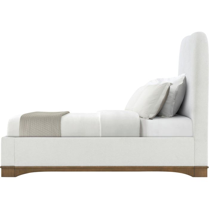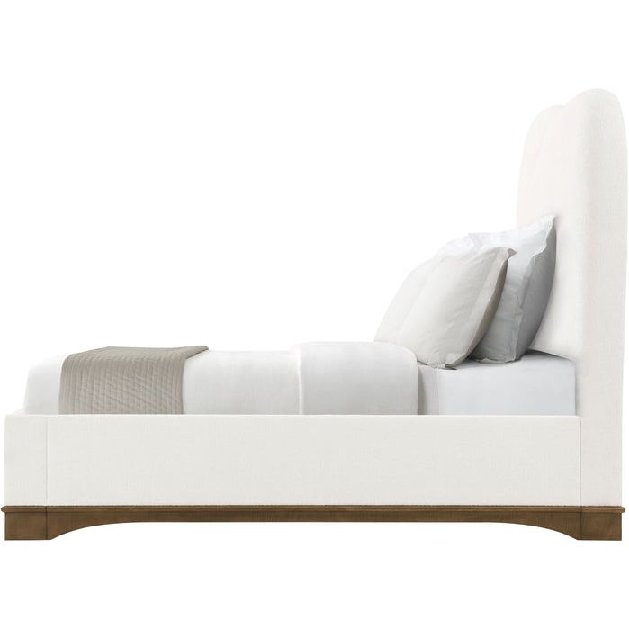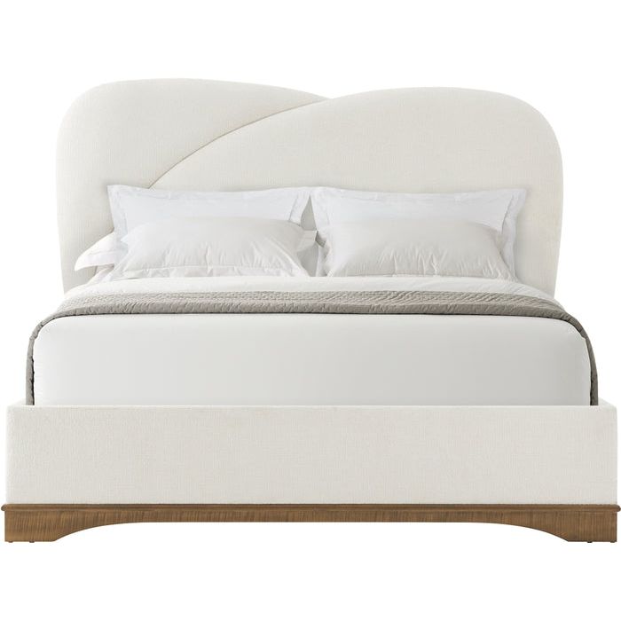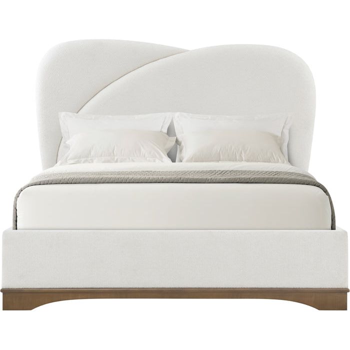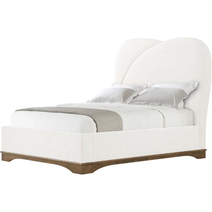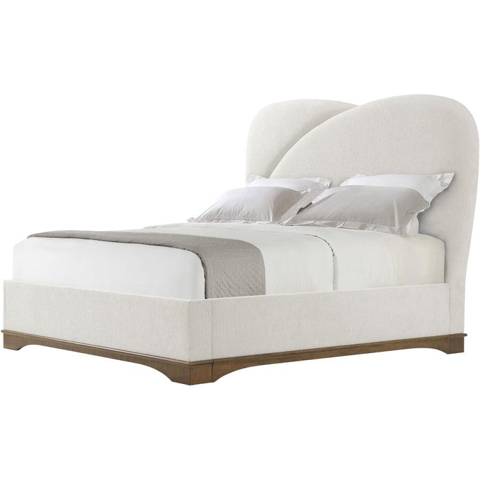 The Origins US Bed recalls the highly influential Streamline Moderne style with elegant, swooping contours a generously upholstered form. Rests atop a figured sycamore base. Accepts a box spring.