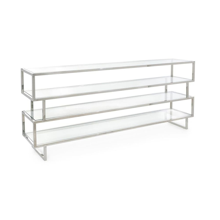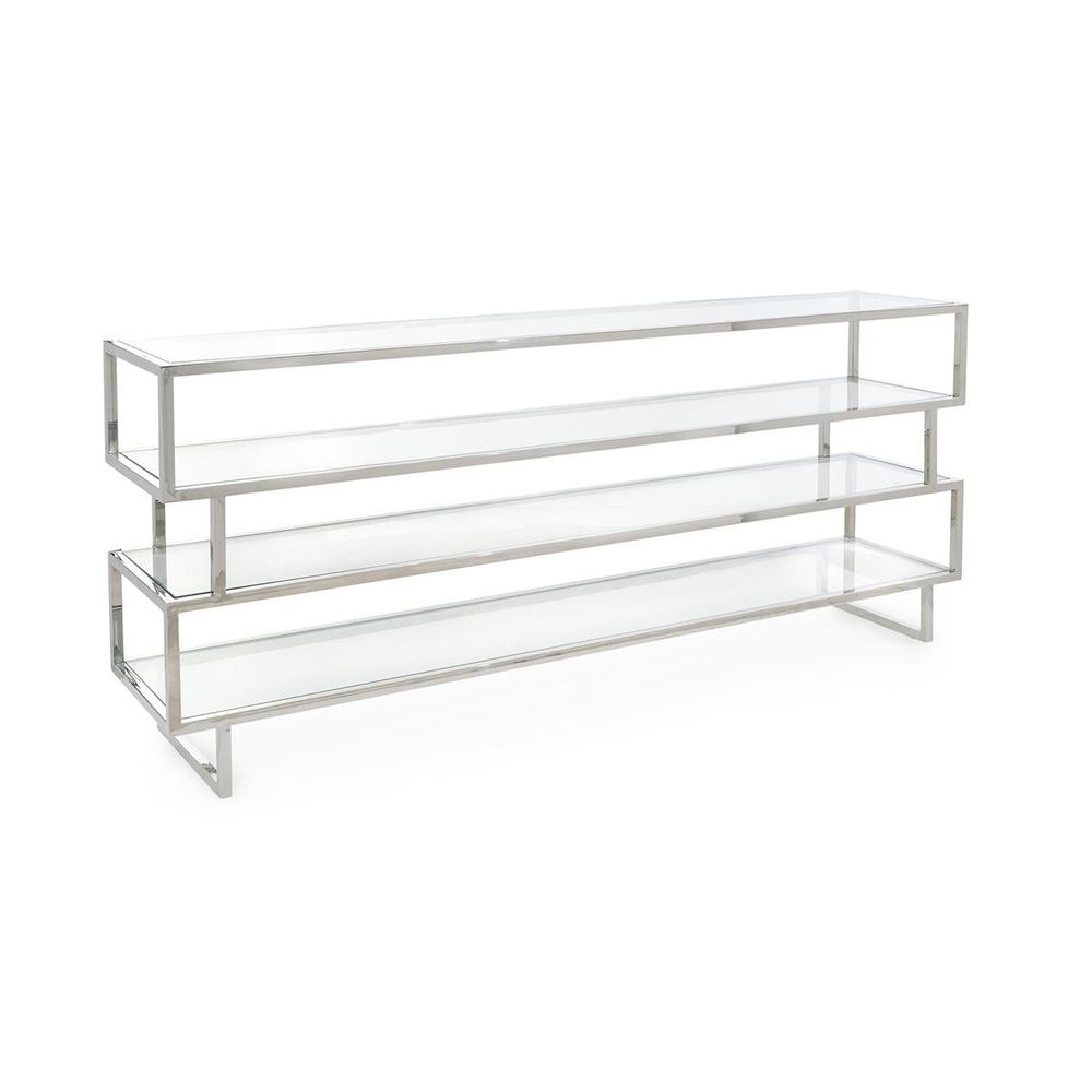 Description: Orion Sofa Table can be used behind sofa's or up against a wall. This contemporary piece of polished stainless steel is functional and perfect for all room settings. 84"W X 18"D X 41"H