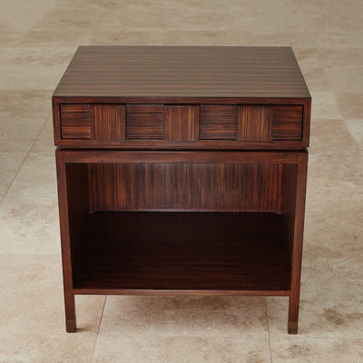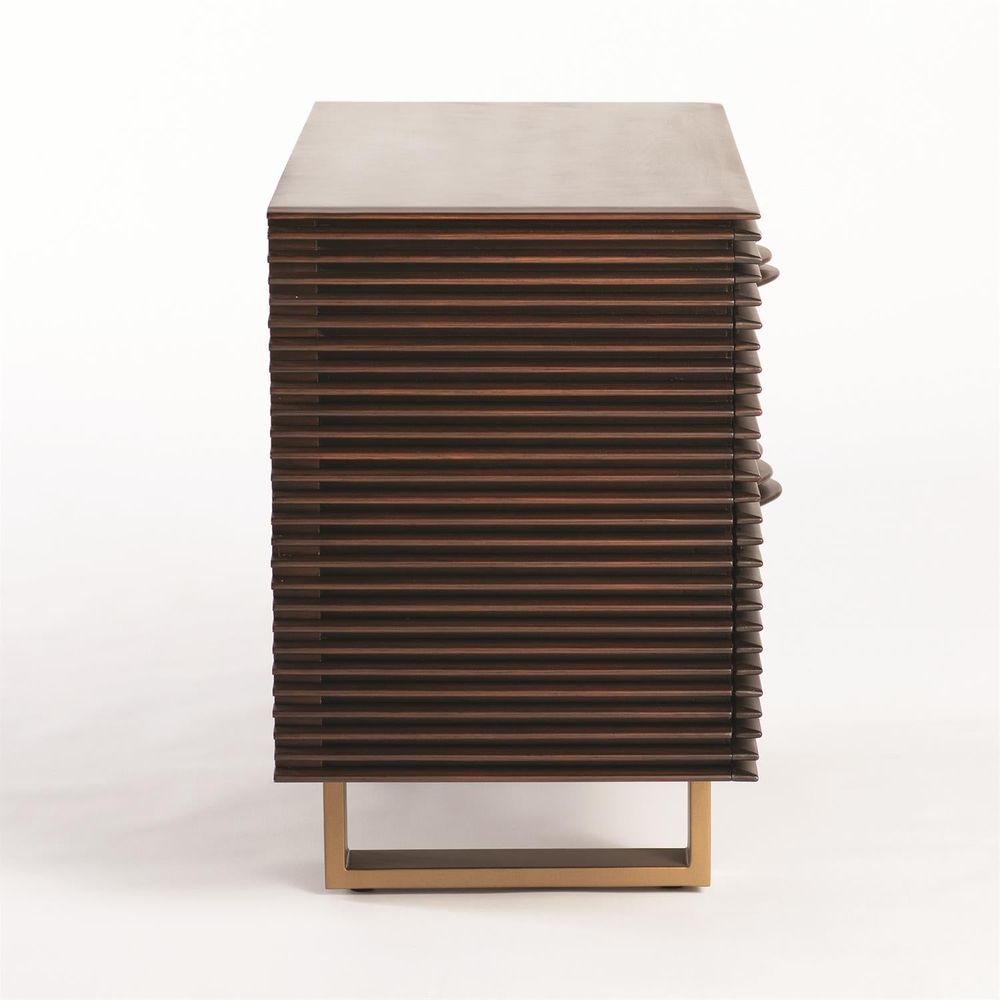 Slats of solid wood are indiviually hand laid to create a modern and luxurious presence. Fluid undulations serve as handles for 6 pull out drawers that open to roomy storage space. Sturdy metal legs provide a lift for a modern feel.