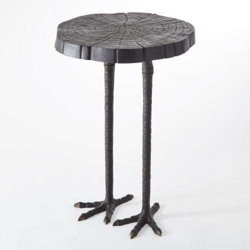 Iron ostrich legs and a wood cut faux bois top make this little side table a whimsical conversation piece.