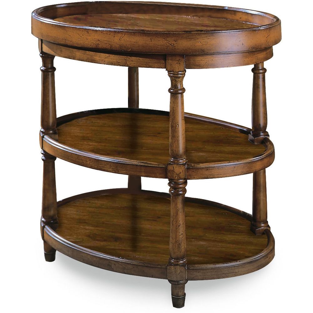 Extend hospitality in style with the lovely oval accent table with a removable serving tray on the top. Crafted of Mappa Burl with decorative veneers, the piece has 2 shelves and brass end caps on the legs. A class apart, this stylish oval accent table offers a removable serving try and turned legs.