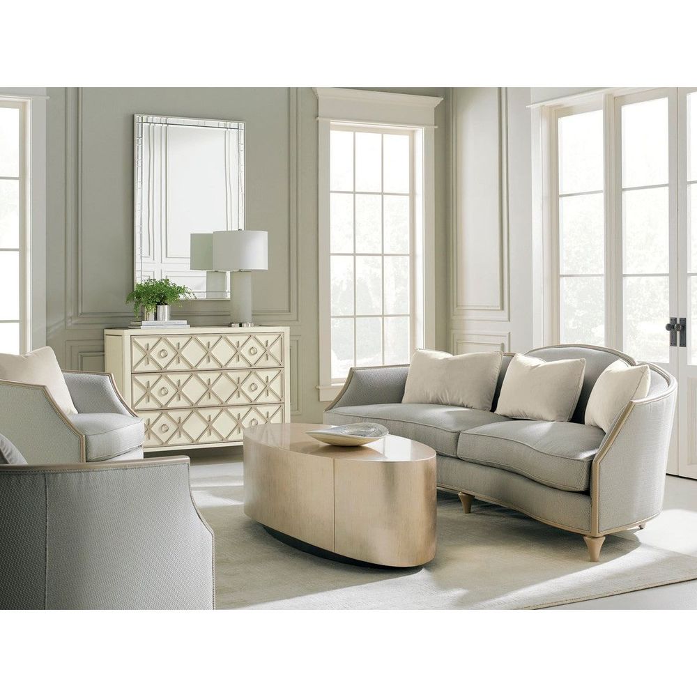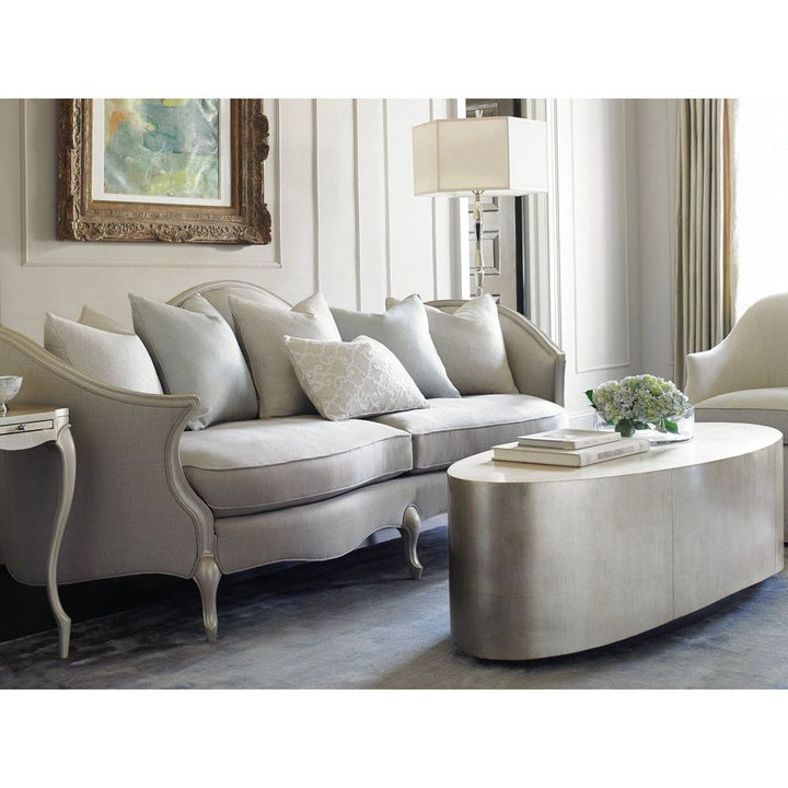 Not only does the oval shape encourage easy movement and flow around a seating area, this clever cocktail table adds such sparkle to a room. Available in our most popular silver and gold leaf finish, Pompeii, and complemented by a rich Charcoal-finished base. A perfect transitional piece - it works in both traditional or contemporary settings.