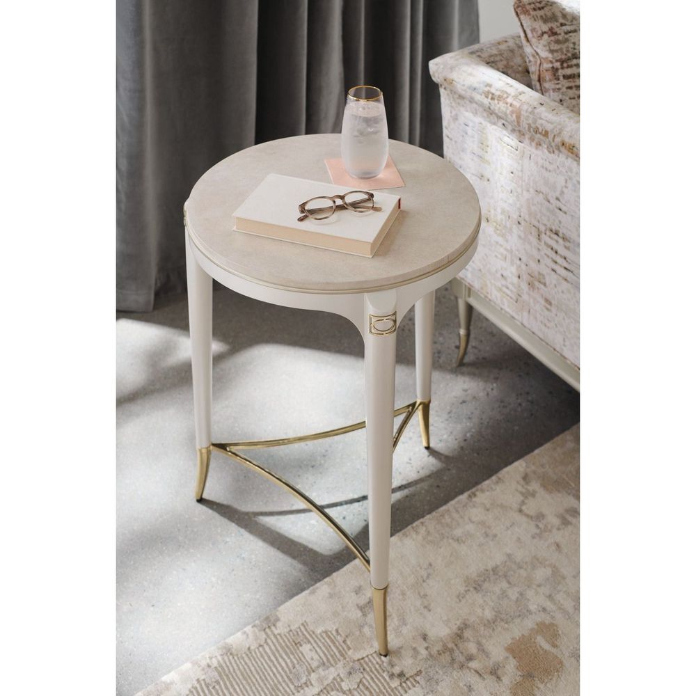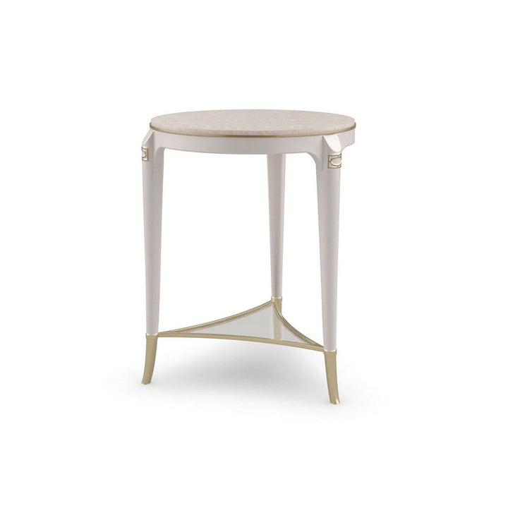 Random-matched Madrona burl creates dreamy, cloud-like swirls atop this elegant end table. The perfect place for setting down a beverage or your favorite book, it features tall, tapered legs adorned with ornate metal buckles and matching ferrules in a Whisper of Gold. A triangular glass shelf adds interest and a light, airy surface for decor.