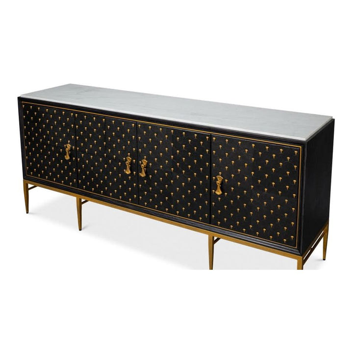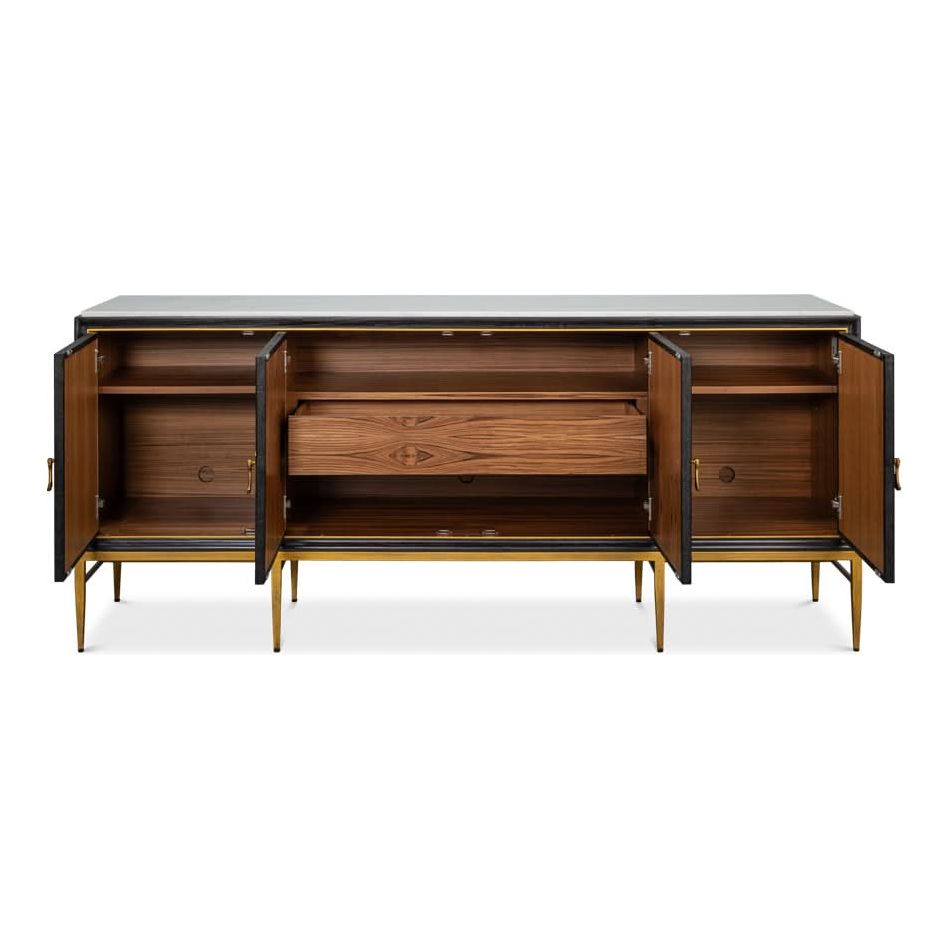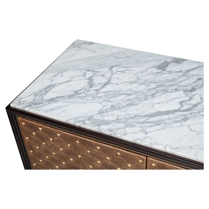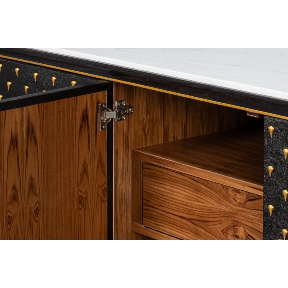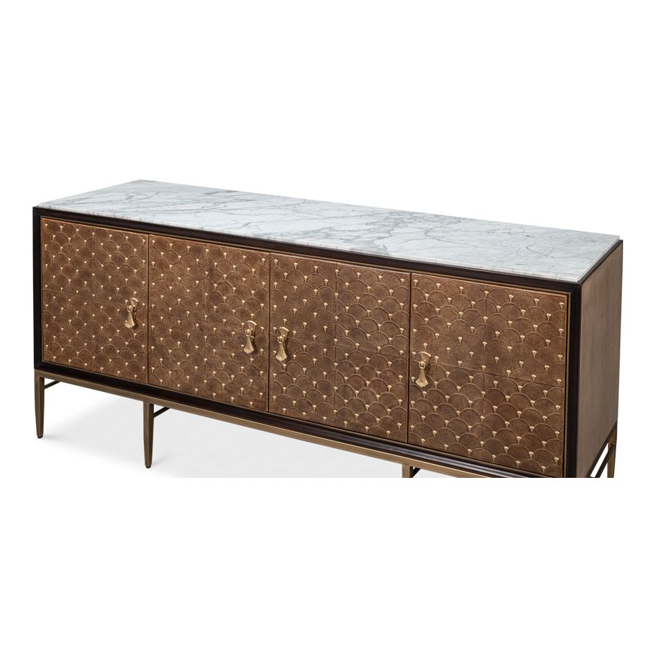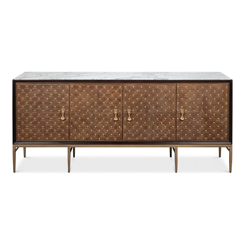Introducing our Palisade Shagreen Credenza, a contemporary marvel crafted from a fusion of Wood, Metal, Leather, Veneer adorned with Italian Satuario Marble. This exquisite piece exudes modern elegance and sophistication, elevating any space with its luxurious design and impeccable craftsmanship.