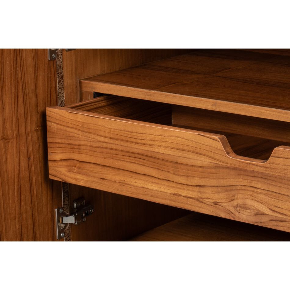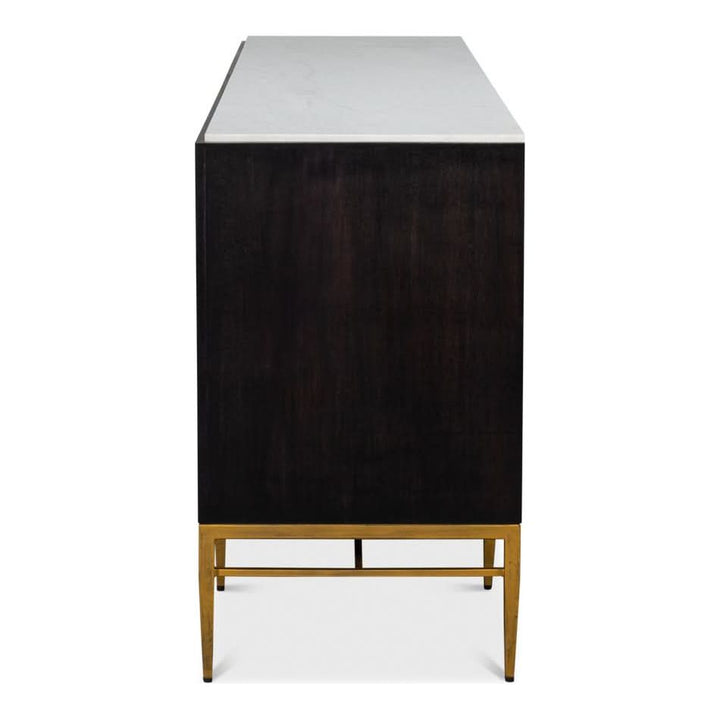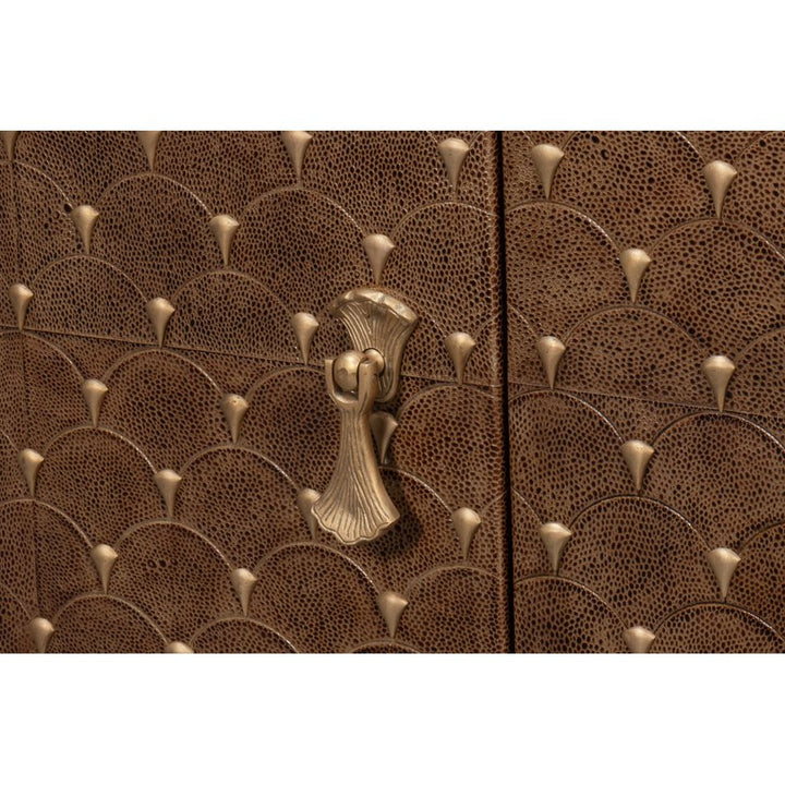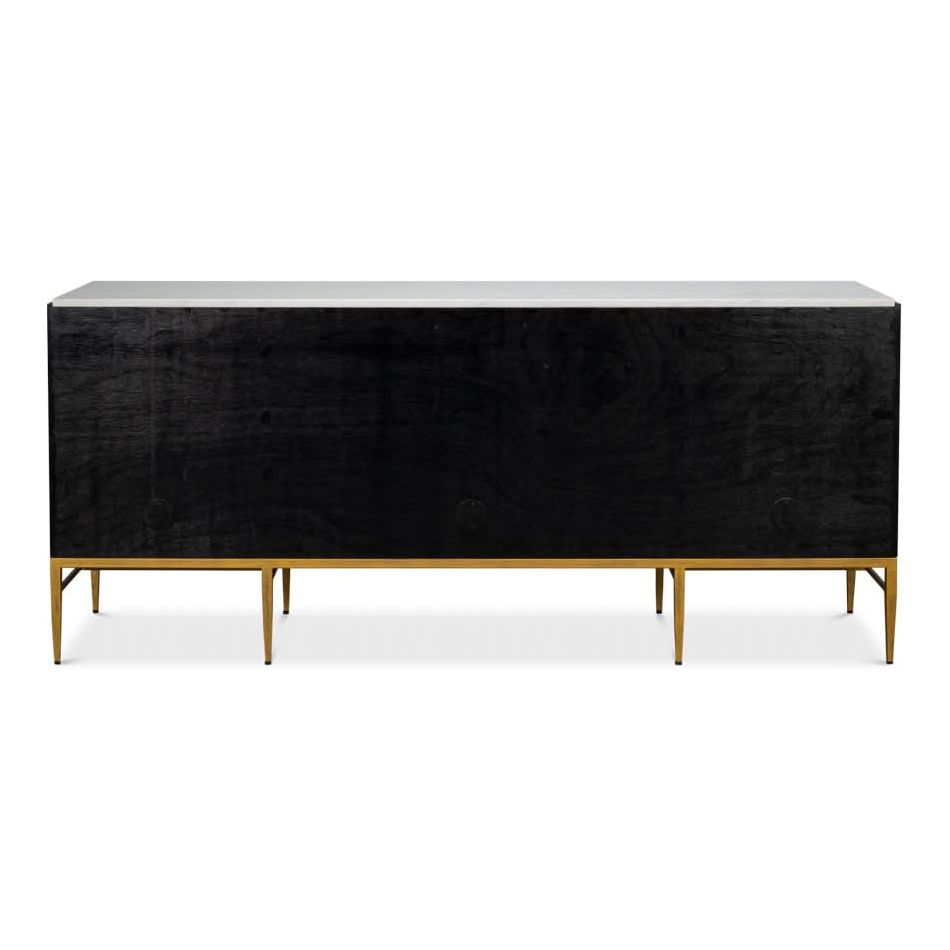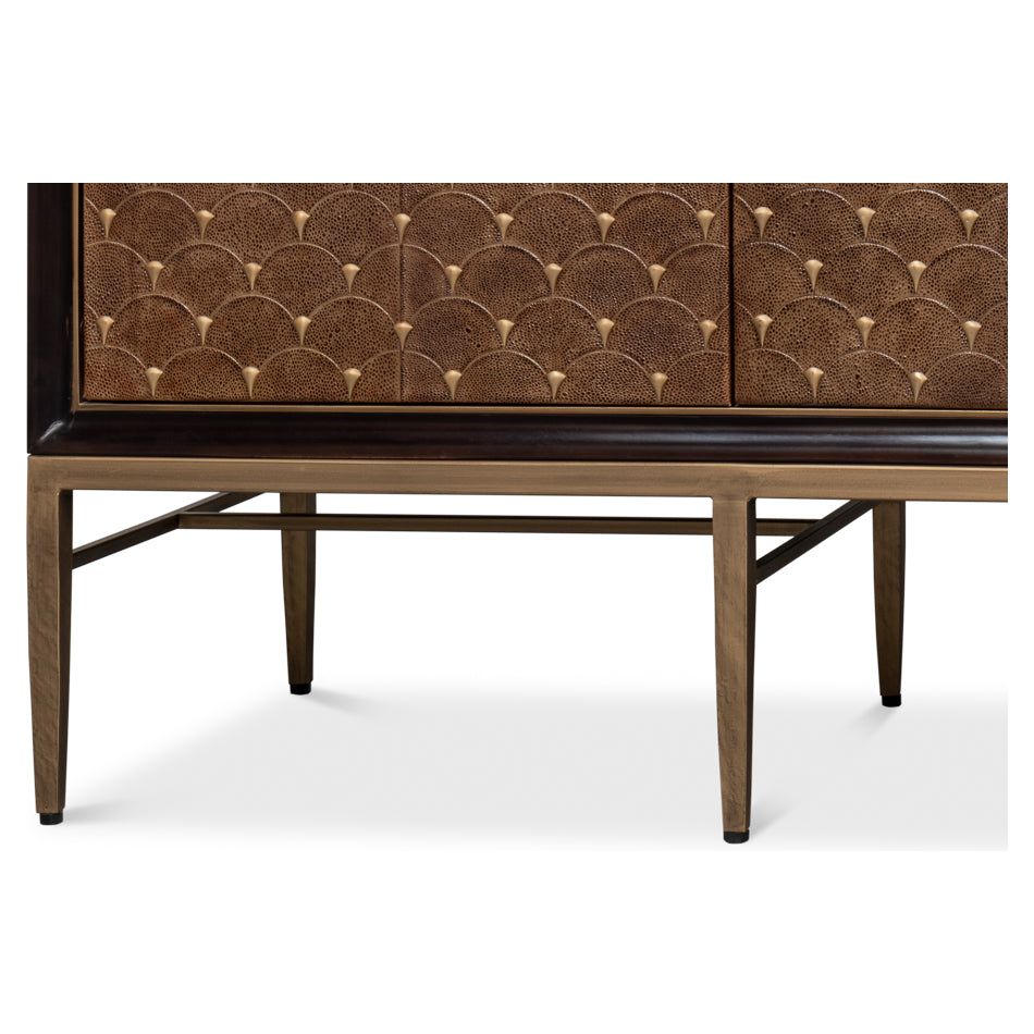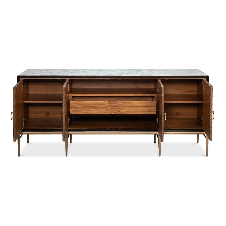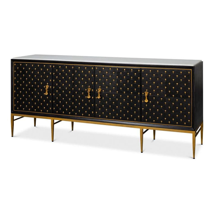 Introducing our Palisade Shagreen Credenza, a contemporary marvel crafted from a fusion of Wood, Metal, Leather, Veneer adorned with Italian Satuario Marble. This exquisite piece exudes modern elegance and sophistication, elevating any space with its luxurious design and impeccable craftsmanship.