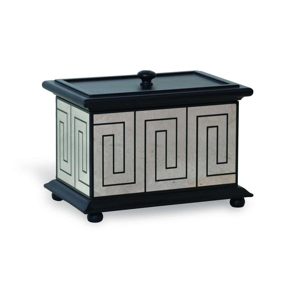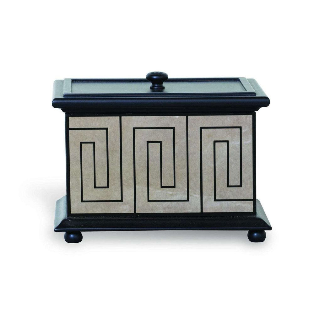 Our Palisades silver rectangle box is finished in black with reverse antiqued mirror panels featuring a black greek key pattern. Interior is lined in black velvet.