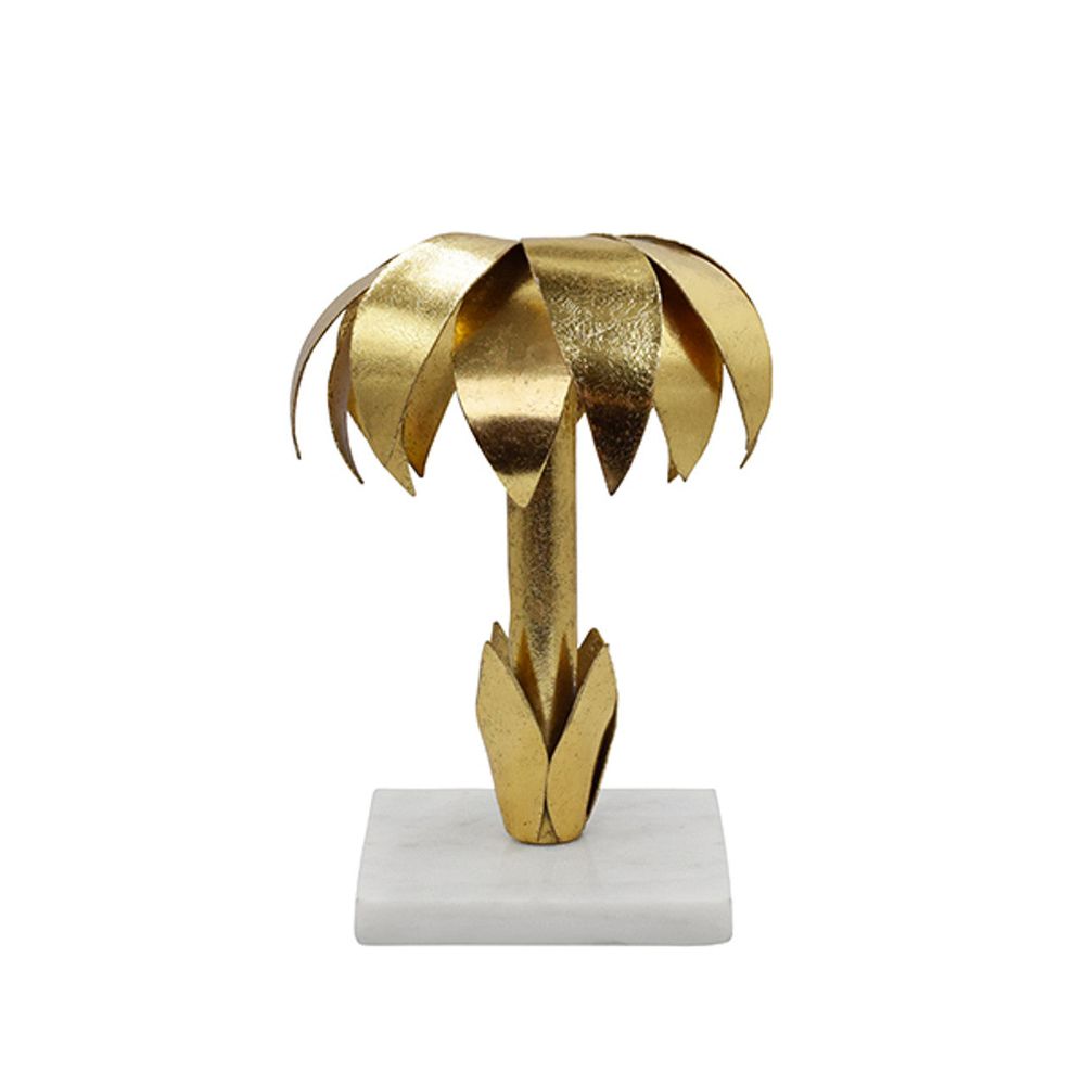 Description: IRON PALM TREE CANDLE HOLDER IN GOLD LEAF FINISH ON WHITE MARBLE BASE *Marble is a natural stone and will vary slightly in color, pattern, and veining.